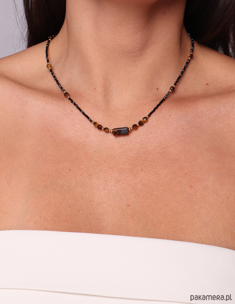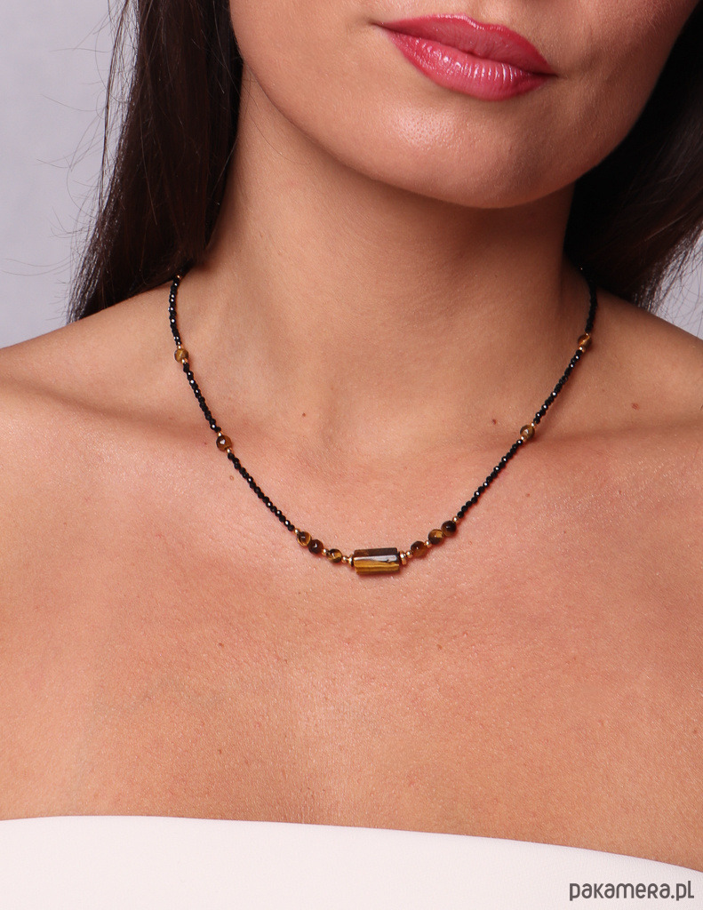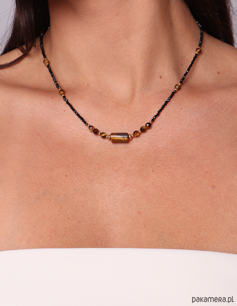 Naszyjnik stworzony z drobnych fasetowanych kamieni czarnego turmalinu, złoconego hematytu oraz naturalnego tygrysiego oka w ciepłych, miodowo-brązowych barwach. Centralna belka z tygrysiego oka sprawia, że całość jest mocna, przyciągająca wzrok i pełna energetycznego charakteru.