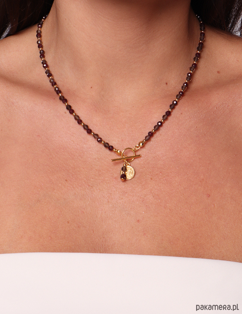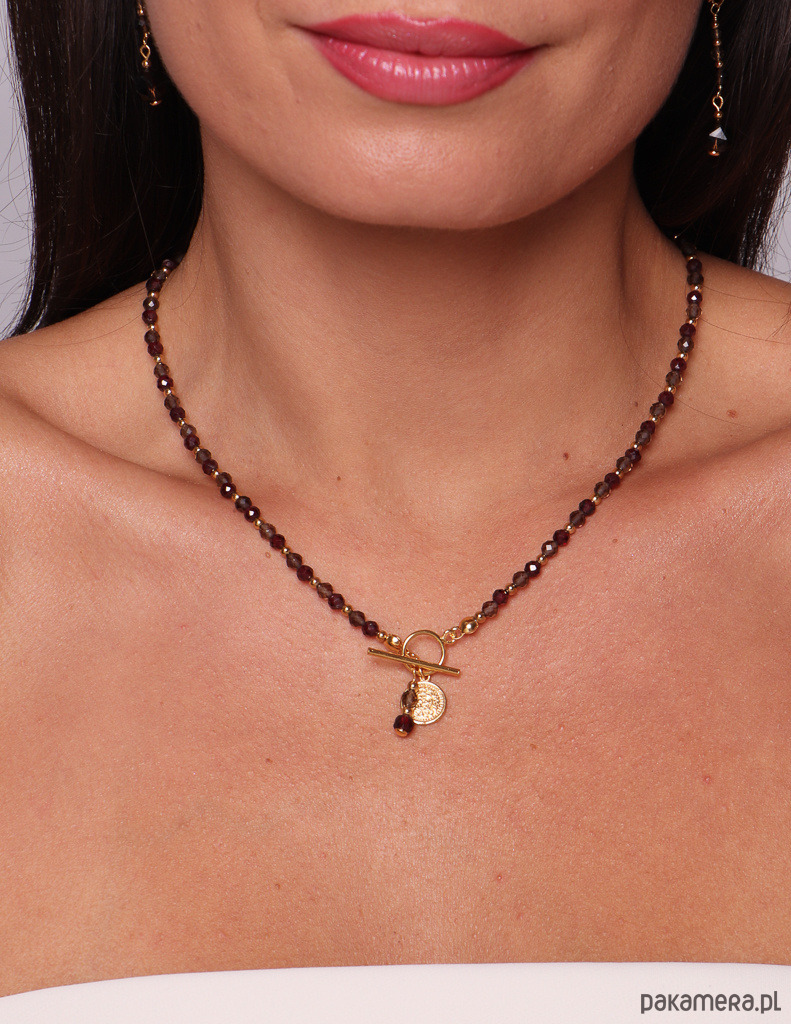 Naszyjnik z granatu i kwarcu dymnego o wielkości ok. 4 mm, wykończony złoconym hematytem i ozdobnym zapięciem toggle na środku, to biżuteria o wyjątkowej sile i elegancji. Podwójna zawieszka – złota monetka i zawieszka z kamieni – dodaje całości talizmanicznego, luksusowego charakteru.