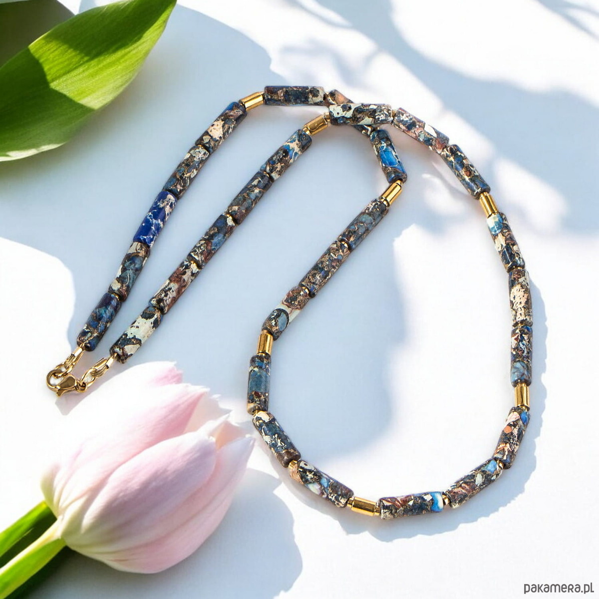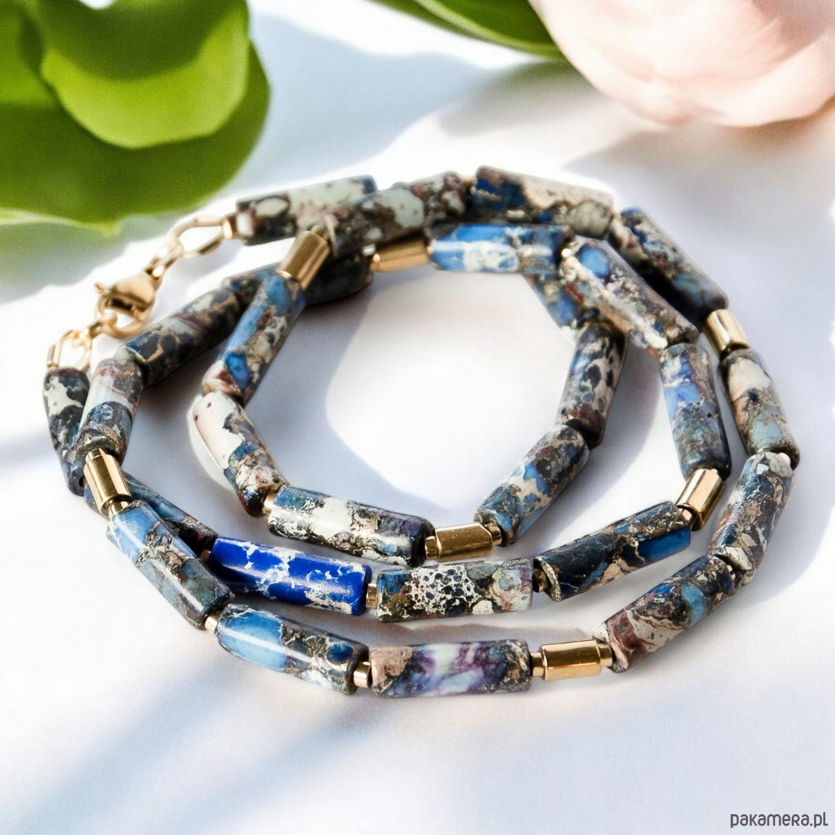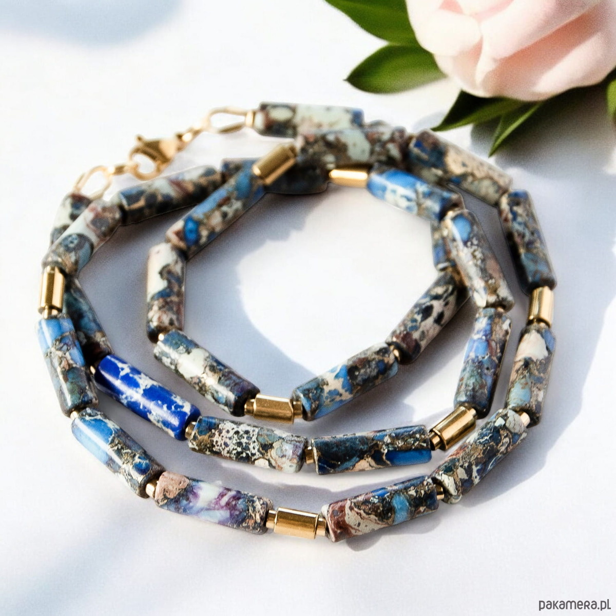 Elegancki i niepowtarzalny naszyjnik wykonany z naturalnych kamieni szlachetnych i półszlachetnych, wykończony elementami ze stali szlachetnej.