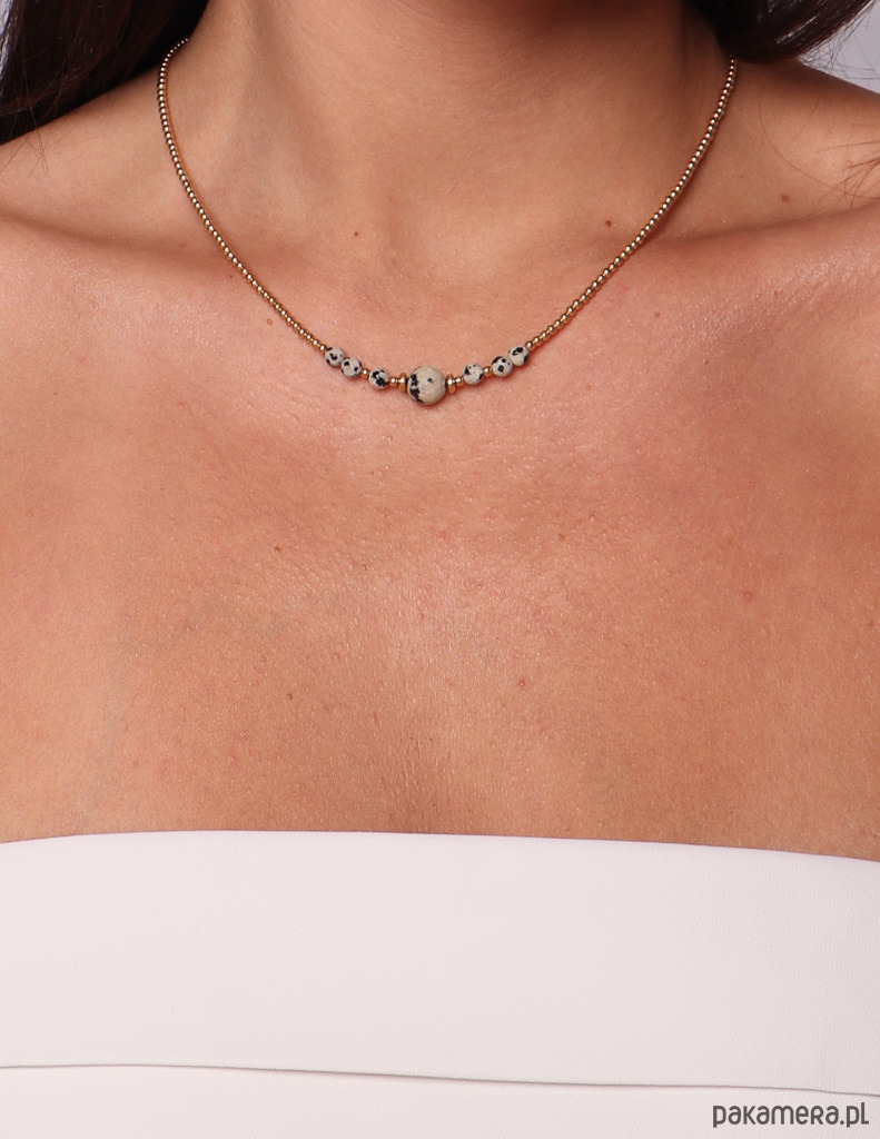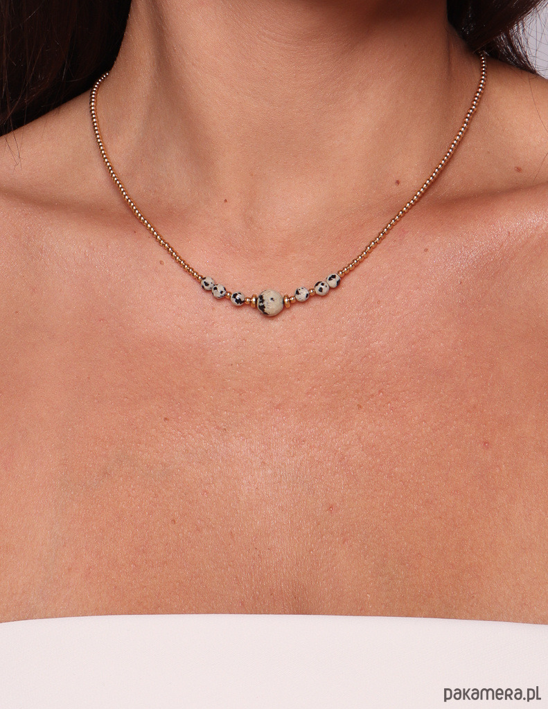 Delikatny i elegancki naszyjnik wykonany z naturalnego jaspisu dalmatyńskiego oraz złoconego hematytu. Centralna część naszyjnika to kompozycja z większego kamienia jaspisu oraz drobniejszych koralików po bokach — każdy o charakterystycznym, beżowym kolorze z czarnymi plamkami, które czynią ten minerał absolutnie niepowtarzalnym.