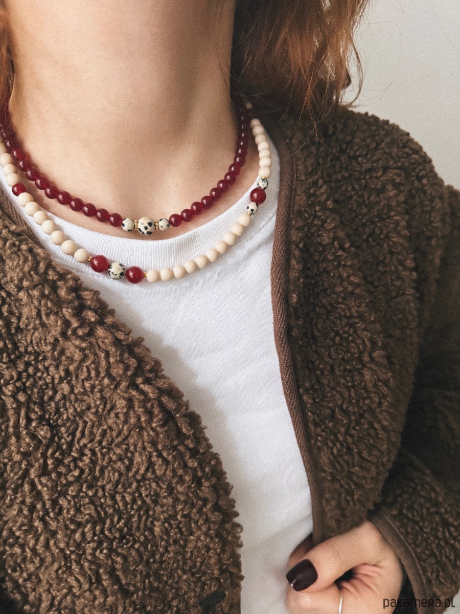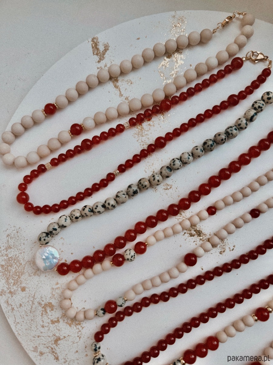 Ten unikalny naszyjnik to połączenie naturalnych kamieni, które razem tworzą wyjątkową kompozycję pełną charakteru. Wykonany ręcznie, składa się z kamienia rzecznego, jaspisu dalmatyńskiego i granatu – każdy z tych kamieni ma swoją unikalną energię, która wzmacnia całość. Jaspis dalmatyński o charakterystycznym wzorze wprowadza element radości i spontaniczności, natomiast czerwony granat, symbolizujący pasję i siłę, nadaje biżuterii głębi. Kamień rzeczny, z jego matową powierzchnią, dodaje harmonii i spokoju.