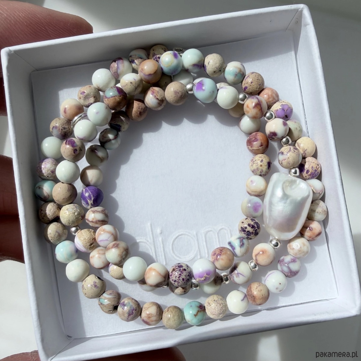 Połączenie jaspisu i pereł sprawia, że naszyjnik prezentuje się lekko, romantycznie i bardzo elegancko. To model, który pięknie dopełnia codzienne stylizacje, ale równie dobrze odnajduje się w bardziej dopracowanych, kobiecych zestawach. Możesz nosić go solo jako delikatny akcent albo zestawić z innymi subtelnymi naszyjnikami, tworząc spójną, warstwową kompozycję.