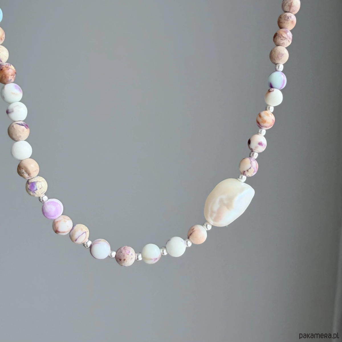 Naszyjnik z kamieni naturalnych Pudrowa Perła to propozycja dla kobiet, które cenią biżuterię delikatną, naturalną i pełną subtelnego uroku. Model został wykonany z naturalnego jaspisu, naturalnych pereł oraz srebra najwyższej próby 925, dzięki czemu zachwyca szlachetnym wykończeniem i harmonijną, kobiecą estetyką.