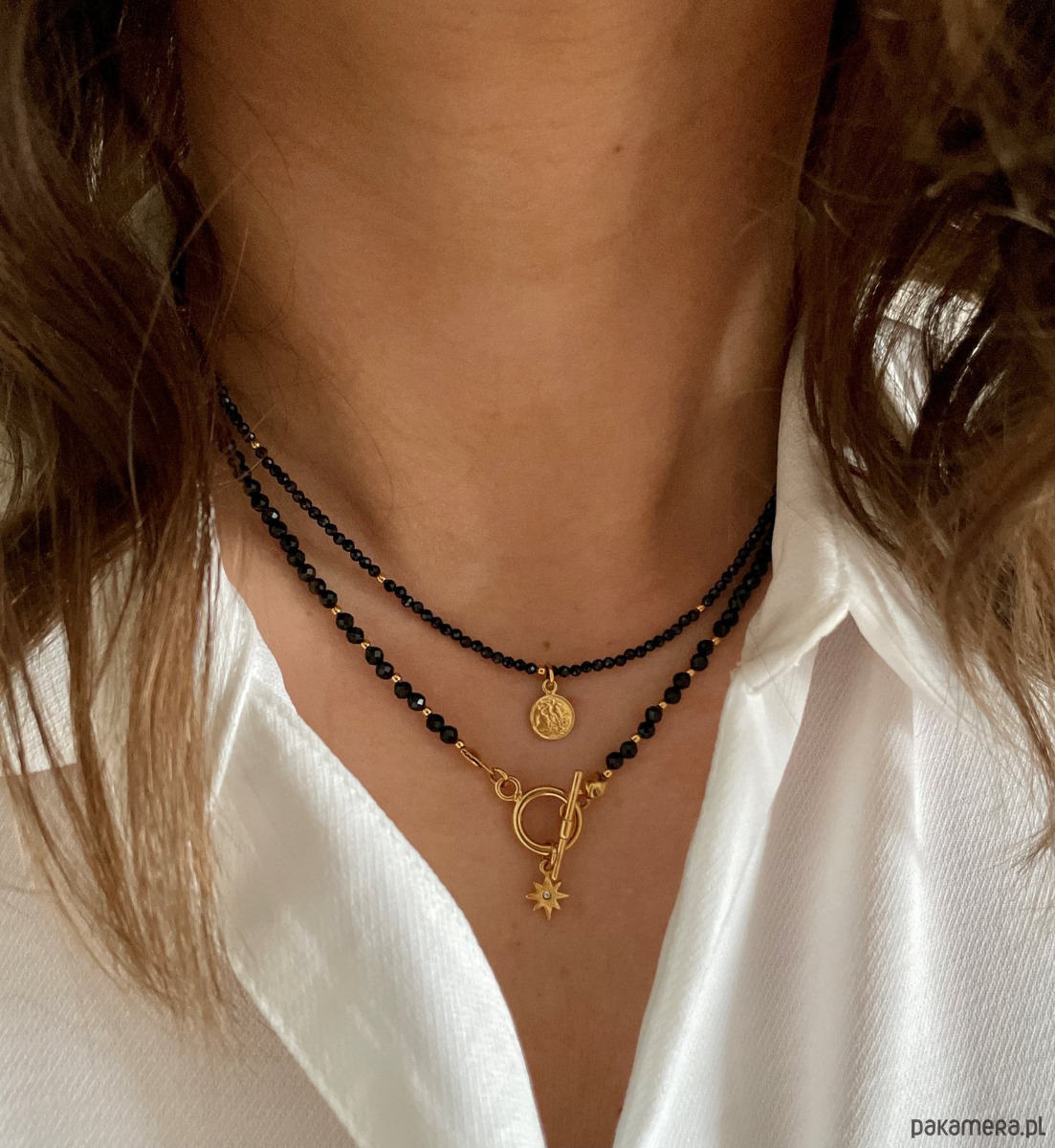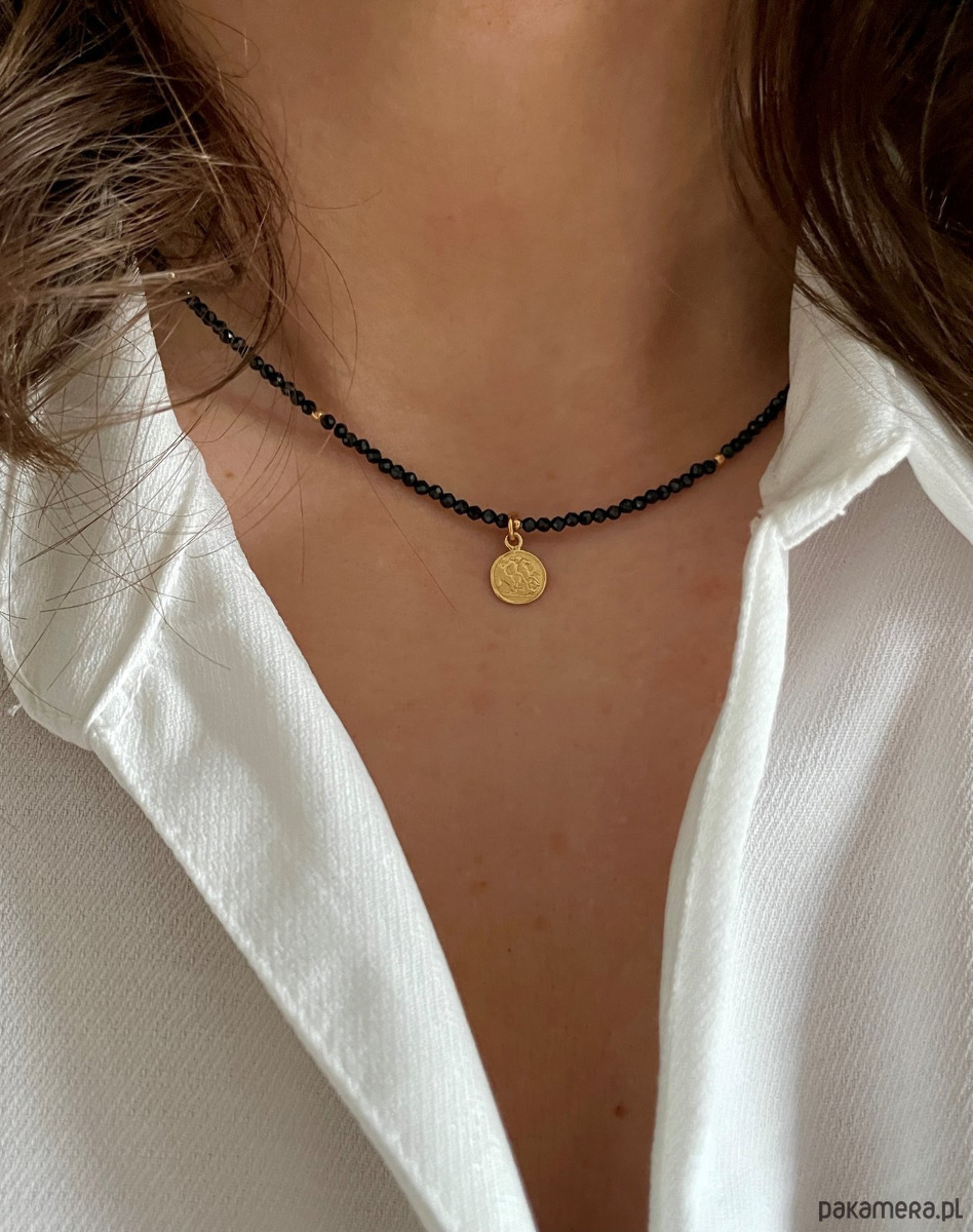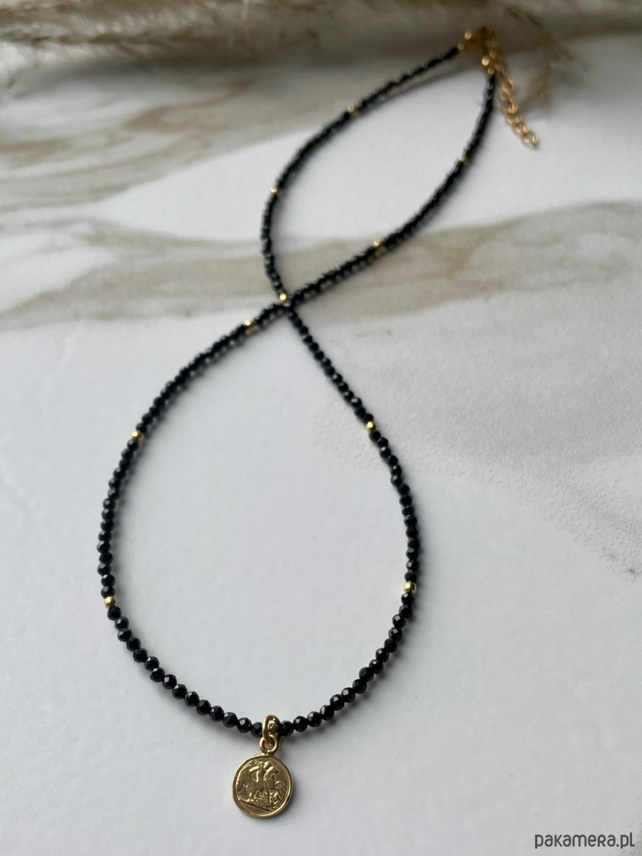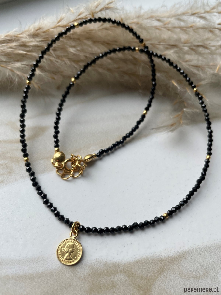 Piękny, klasyczny naszyjnik własnoręcznie wykonany poprzez połączenie głęboko czarnych spineli z pozłacanymi elementami ze srebra próby 925. Jest to jedno z najbardziej klasycznych połączeń, dzięki czemu naszyjnik moża ubierać na wiele różnych okazji i nigdy się nie znudzi. Posiada od klasyczne zapięcie z tyłu, z dodatkiem 3 cm przedłużki, aby móc idealnie dopasowac naszyjnik do swoich potrzeb. Jest to biżuteria, którą każdy powinien mieć w swoim posiadaniu! Naszyjnik ten bardzo łatwo połączyć można z inną biżuterią, przez co możemy nosić go na wiele różnych sposobów.