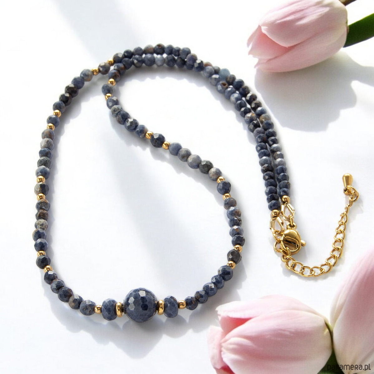 Elegancki i niepowtarzalny naszyjnik wykonany z naturalnych kamieni szlachetnych i półszlachetnych, wykończony elementami ze stali szlachetnej.