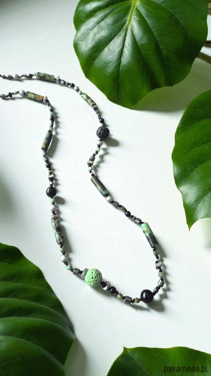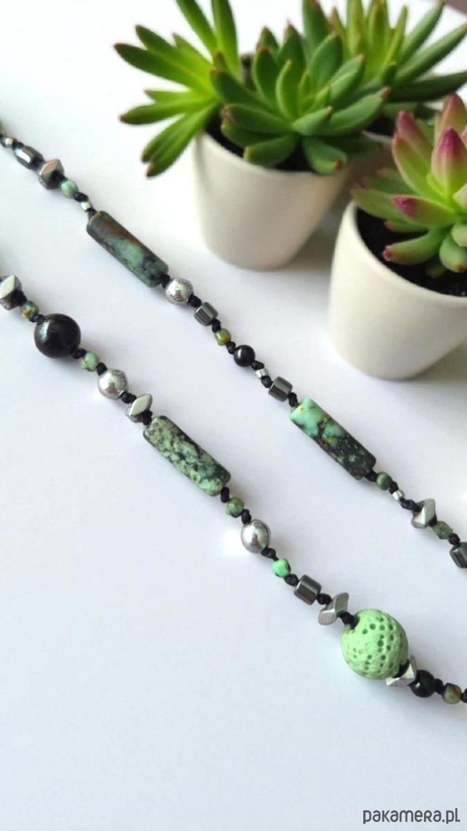 Naszyjnik z kamieni naturalnych – unikatowy egzemplarz – turkus afrykański, hematyt, lawa wulkaniczna, turmalin