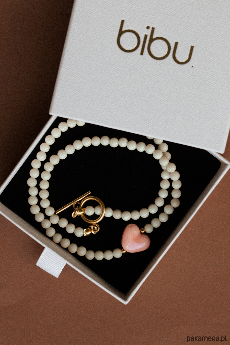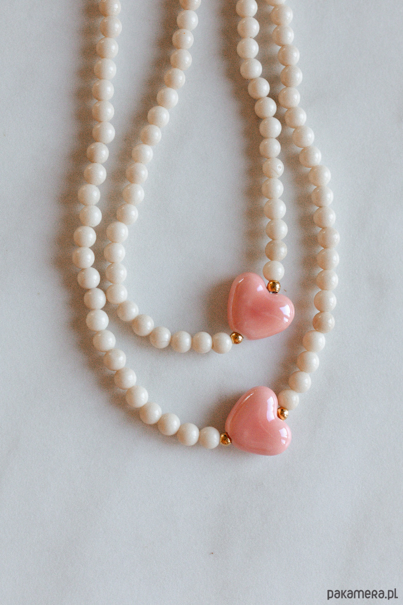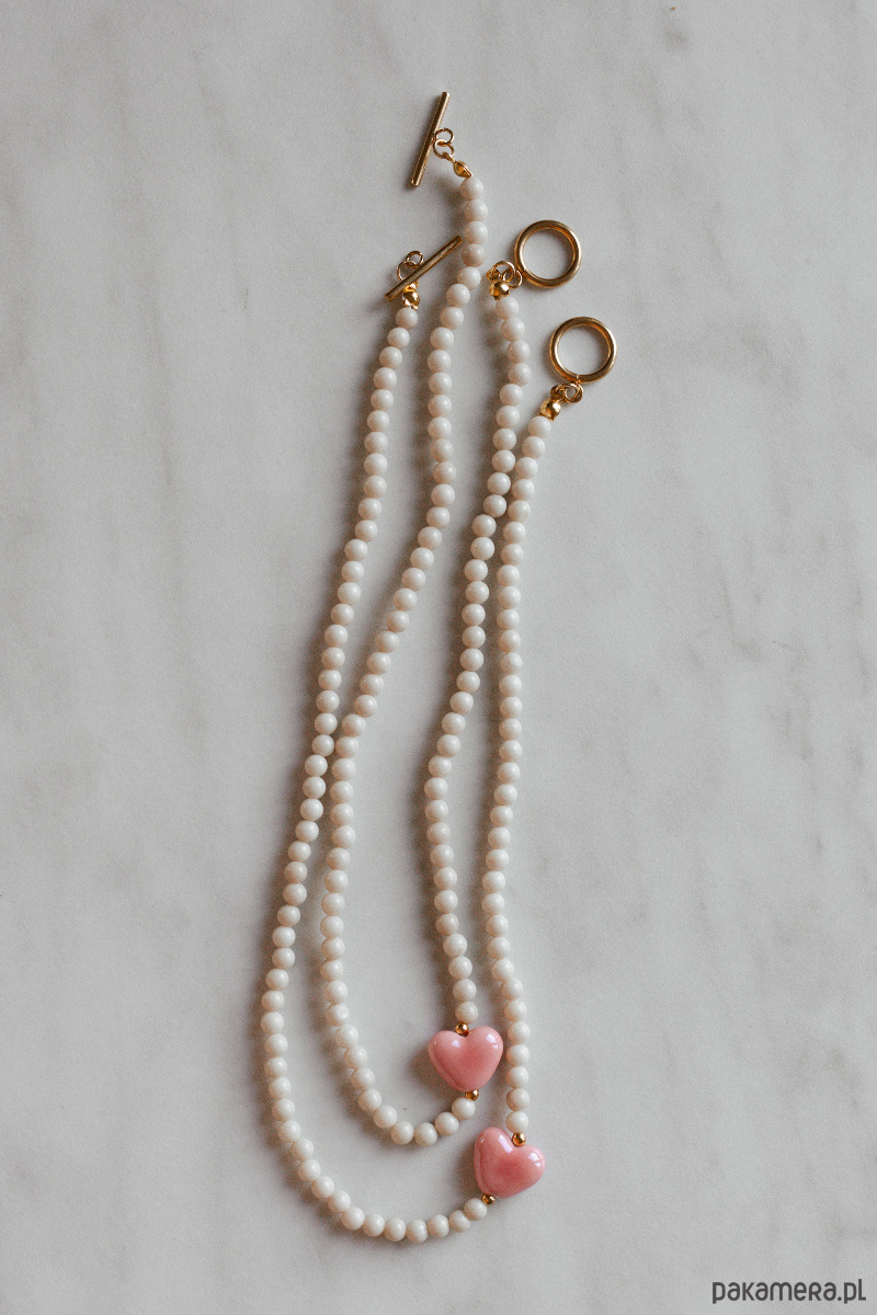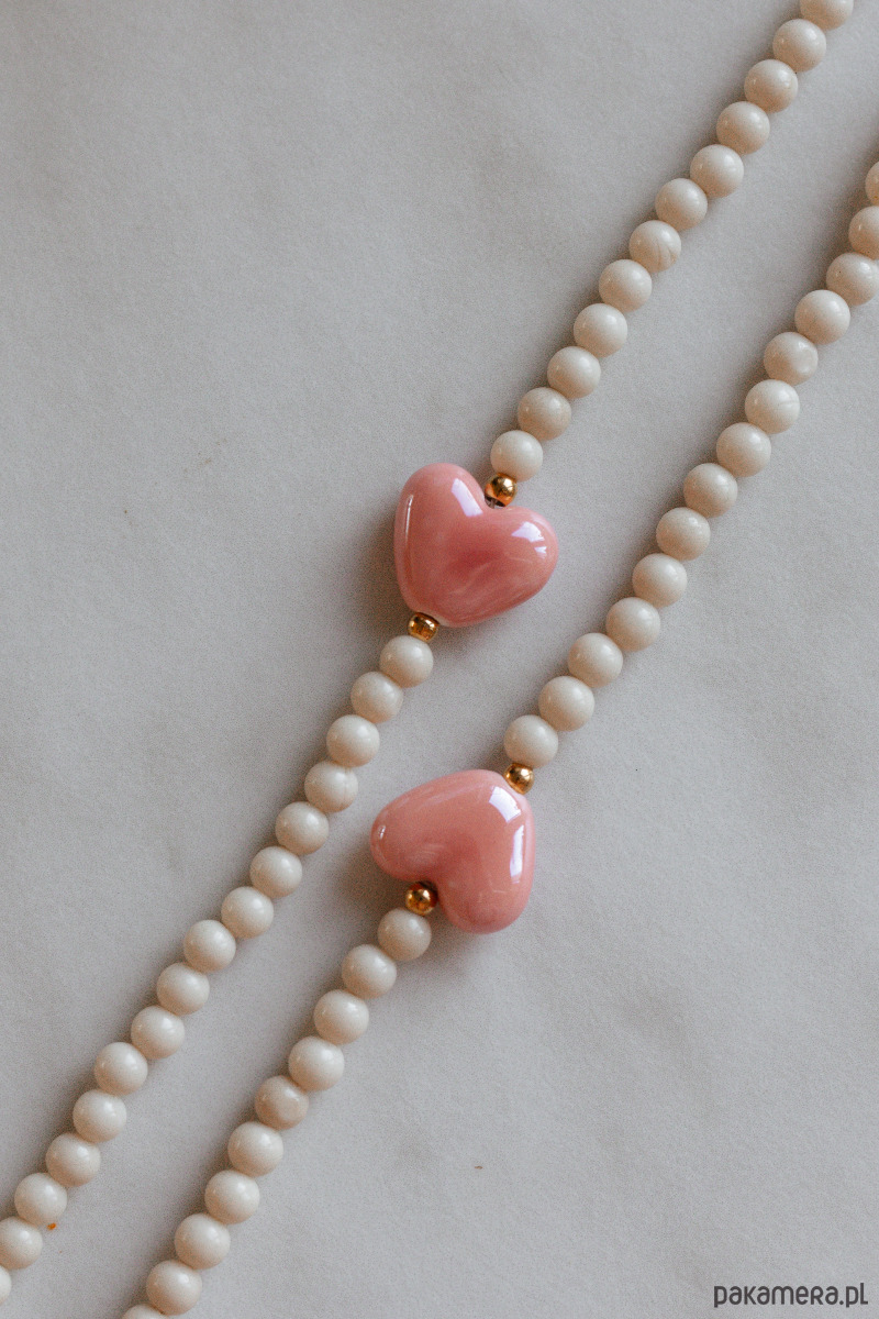 Naszyjnik wykonany z kamieni naturalnych (biały jaspis) wykończony ceramicznym sercem w kolorze pudrowego różu.