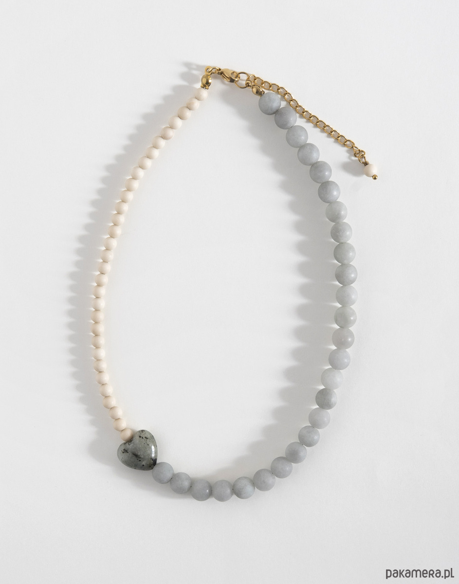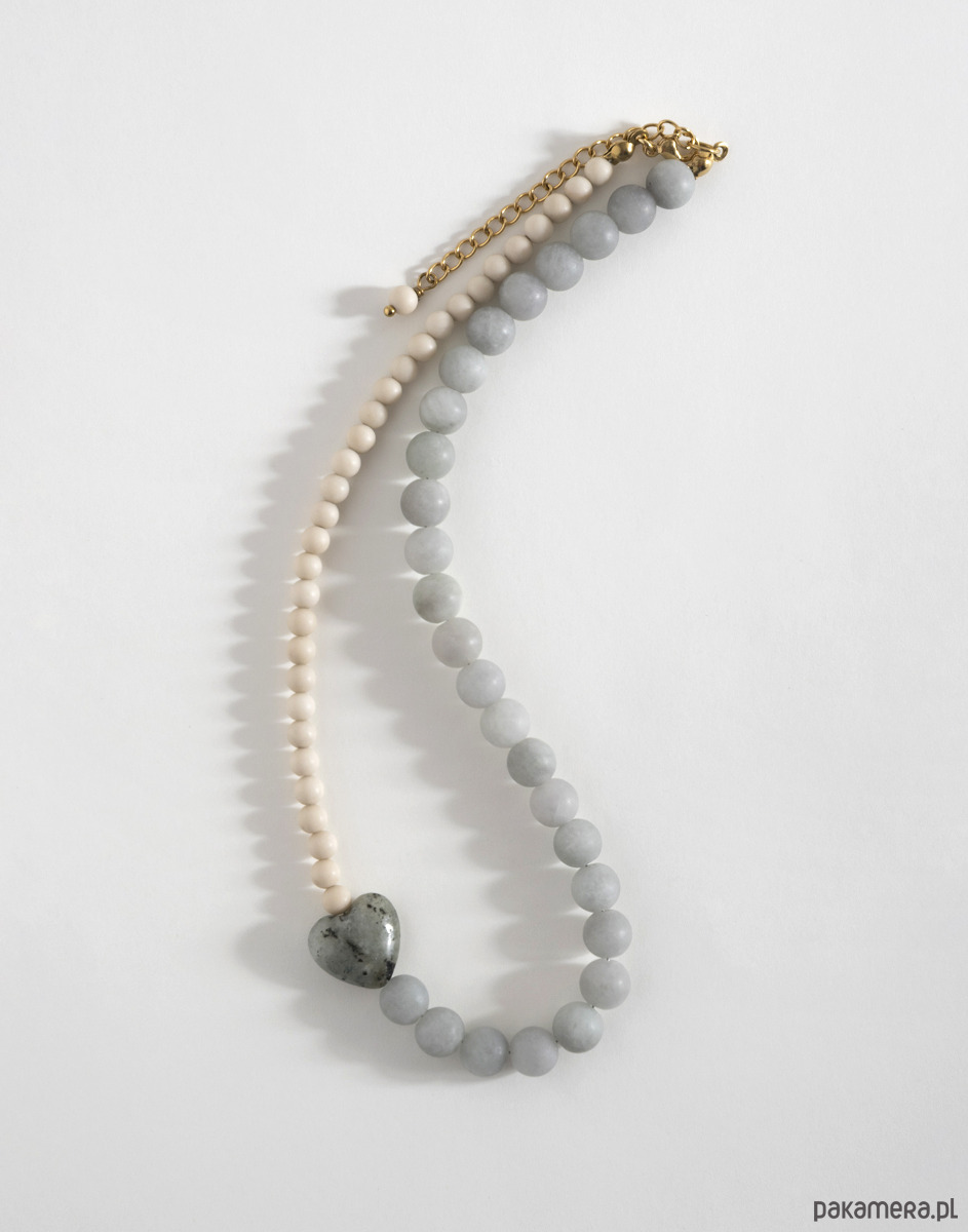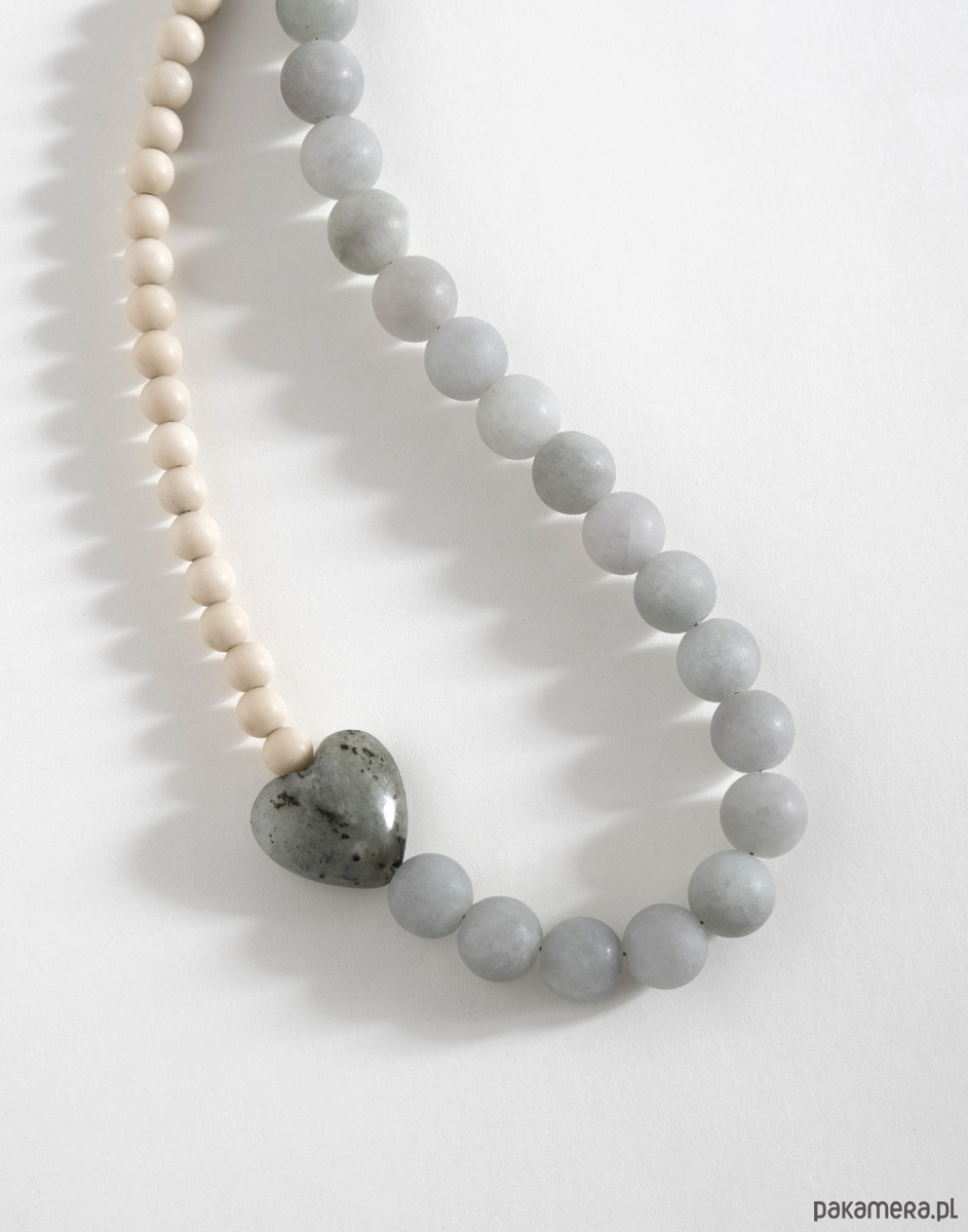 Naszyjnik wykonano ręcznie z naturalnych kamieni. Wykorzystane kamienie to matowy jadeit w kolorze szaro-niebieskim i kamień rzeczny w beżowym odcieniu, a pomiędzy nimi znajduje się serce z labradorytu. Elementy zapięcia wykonano ze złotej stali chirurgicznej.