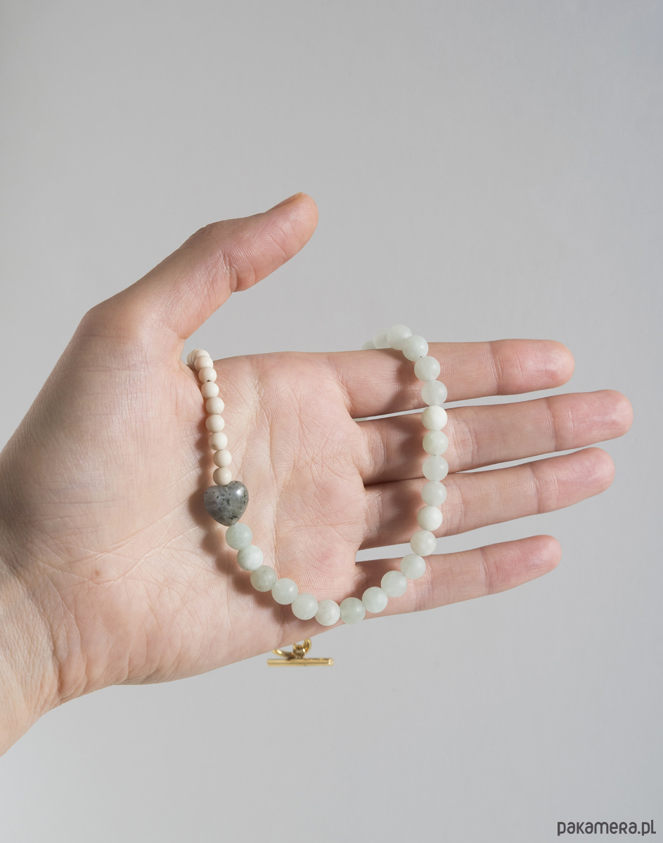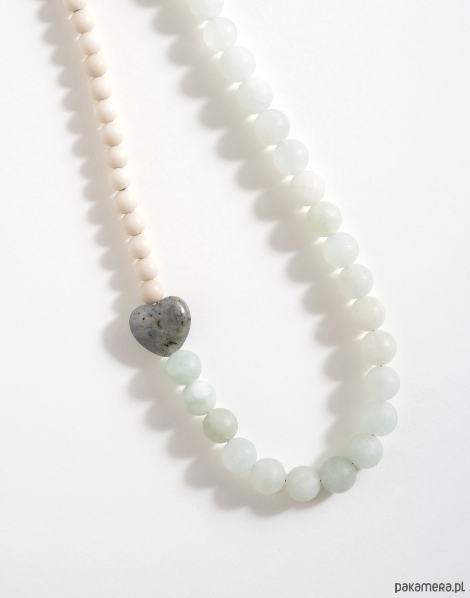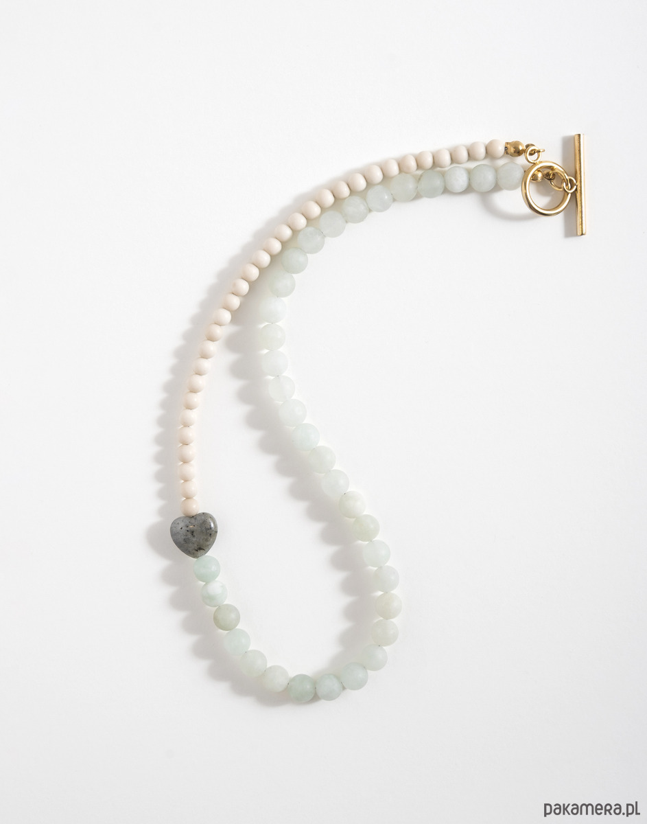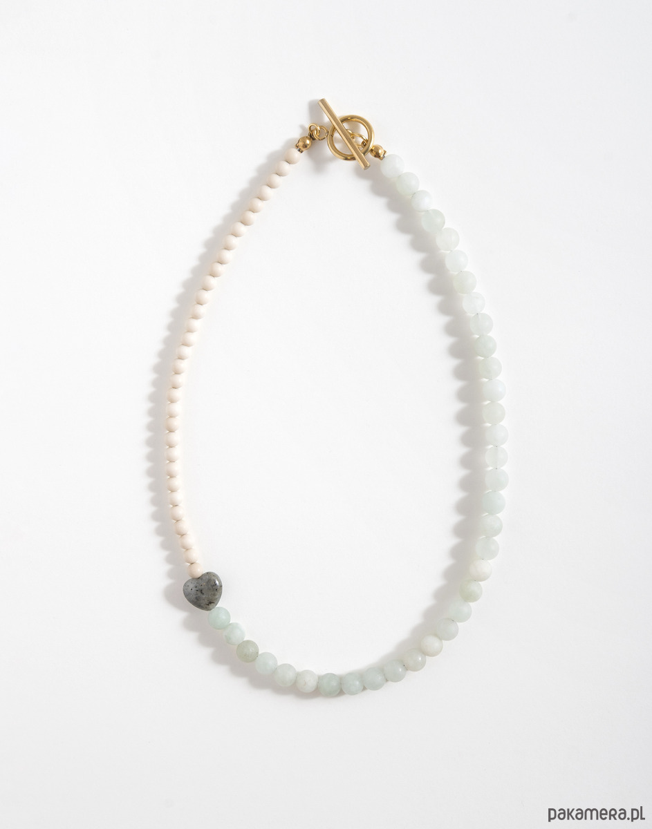 Naszyjnik wykonany ręcznie z naturalnych kamieni: matowego jadeitu oraz kamienia rzecznego w beżowym odcieniu. Centralnym elementem jest serce z larvikitu, które nadaje całości charakteru. Kompozycja kolorów tworzy spokojny, harmonijny efekt. Zapięcie wykonane ze złotej stali chirurgicznej.