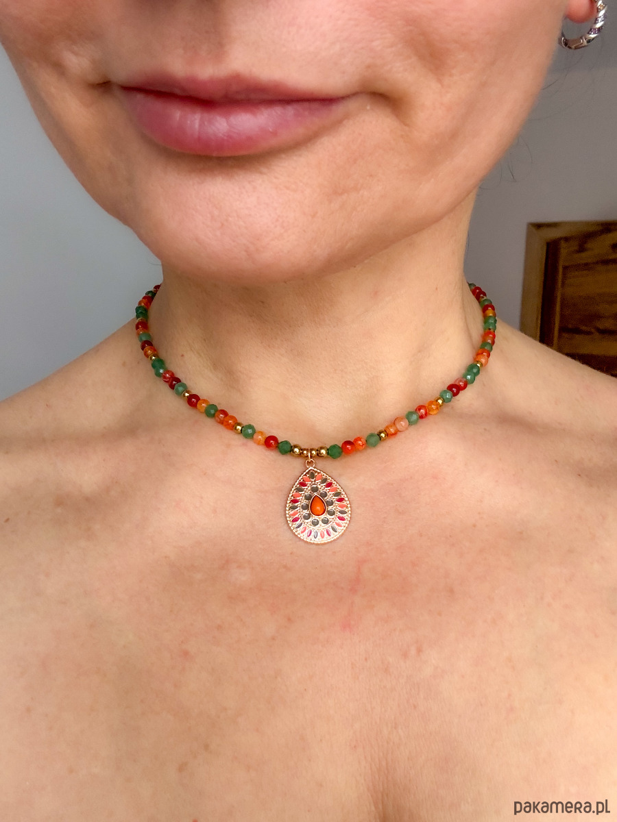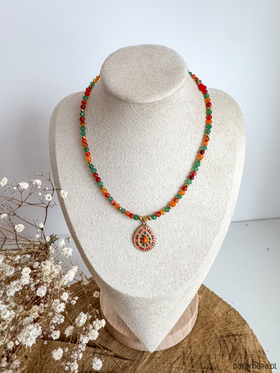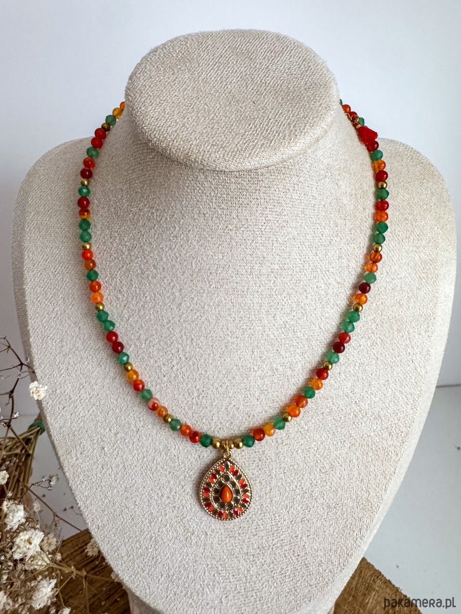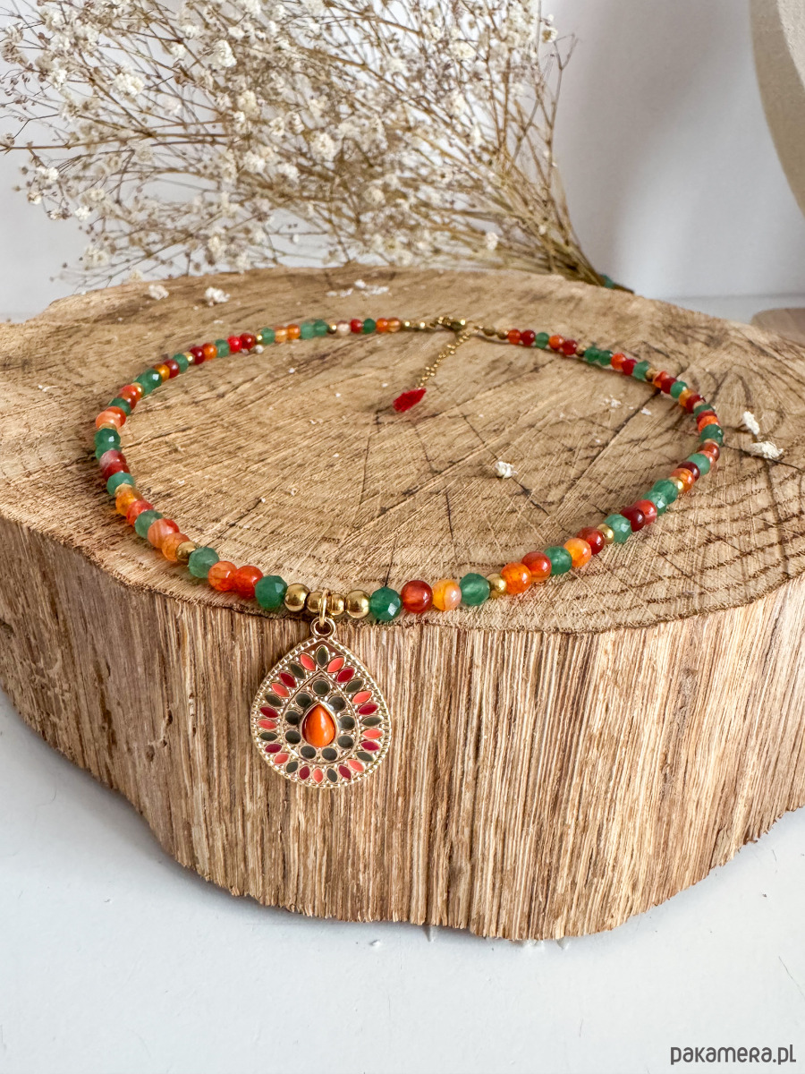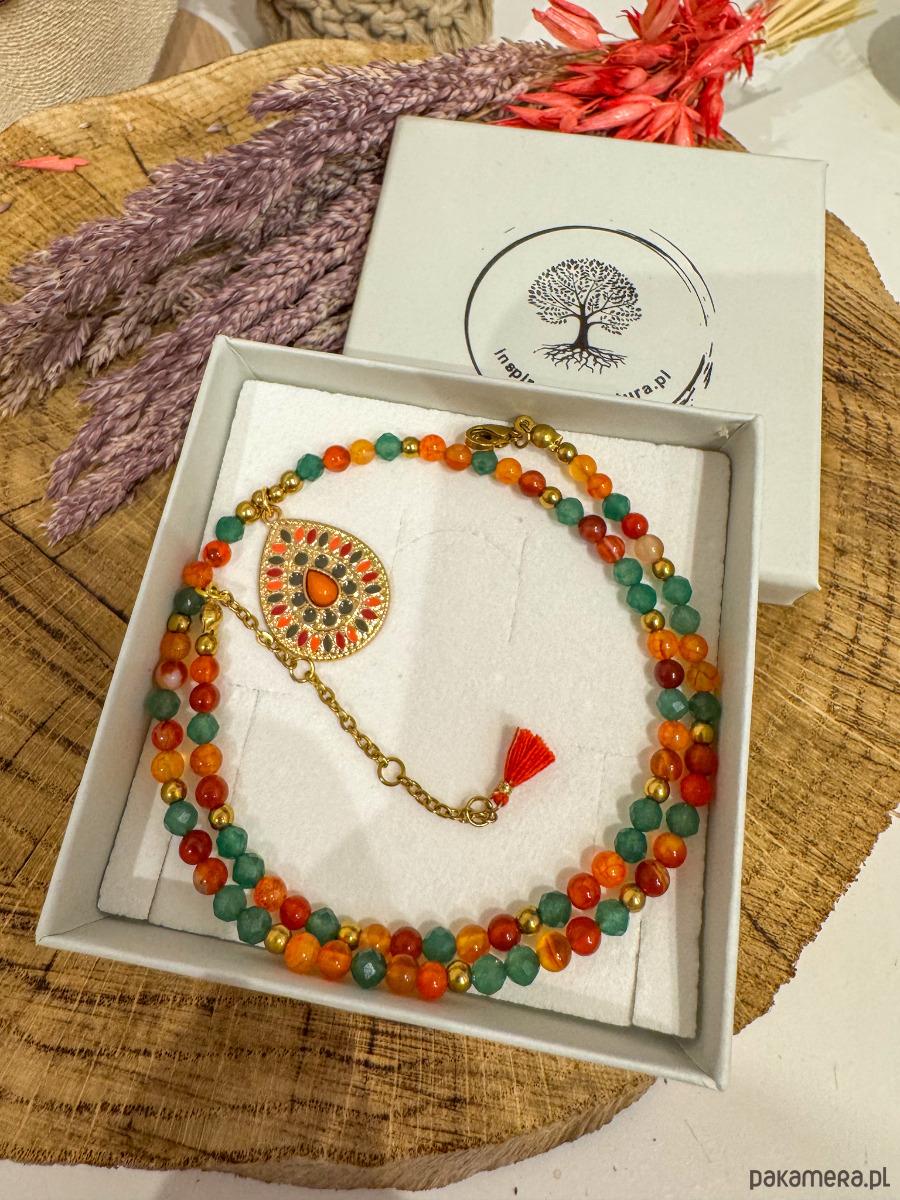 Ręcznie wykonany naszyjnik z agatu karneolowego i zielonego awenturynu, uzupełniony medalionem w stylu boho. To połączenie dla kobiet, które chcą jednocześnie działać odważnie i zachować wewnętrzną równowagę.