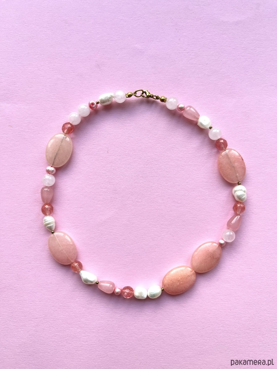 Skład: jadeit, kwarc różowy, perła słodkowodna, hematyt