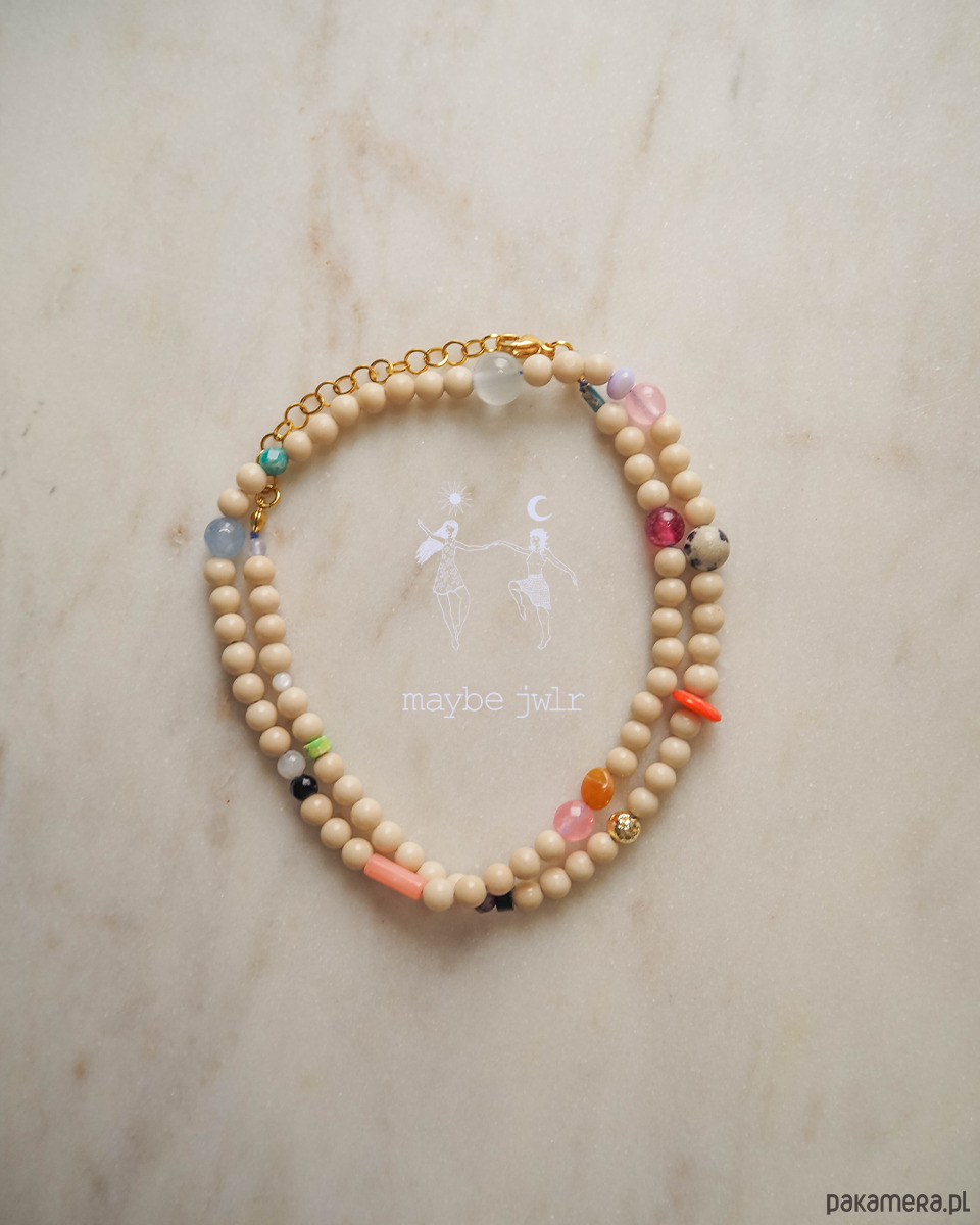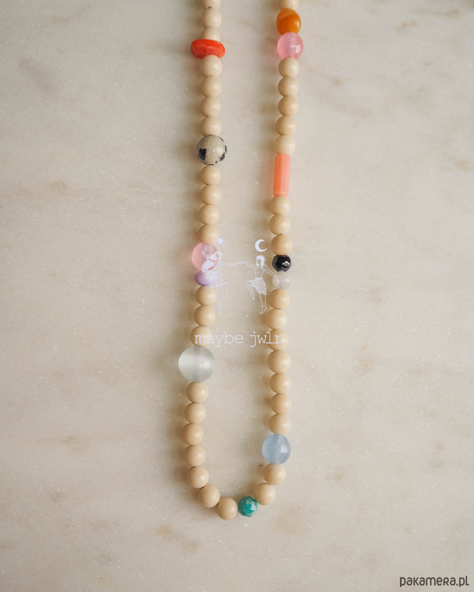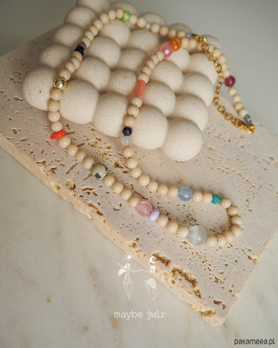 Kobiecy i radosny naszyjnik z kulek kamieni rzecznych 4mm, przeplatany kolorowymi kamieniami takimi jak jadeit, ametyst, amazonit, jaspis, uleksyt, onyks, koral.