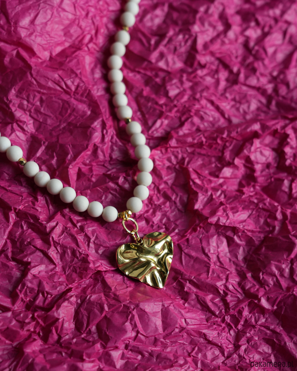 Beżowy naszyjnik choker na lato z matowego KAMIENIA RZECZNEGO i złotego HEMATYTU, z masywną zawieszką w kształcie serca o nieregularnej, gniecionej fakturze. Zawieszka, zapięcie i łańcuszek to STAL SZLACHETNA w kolorze złotym.