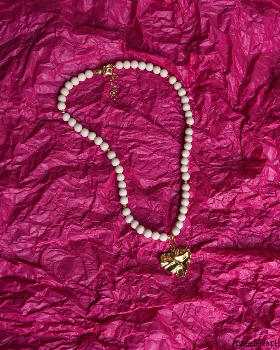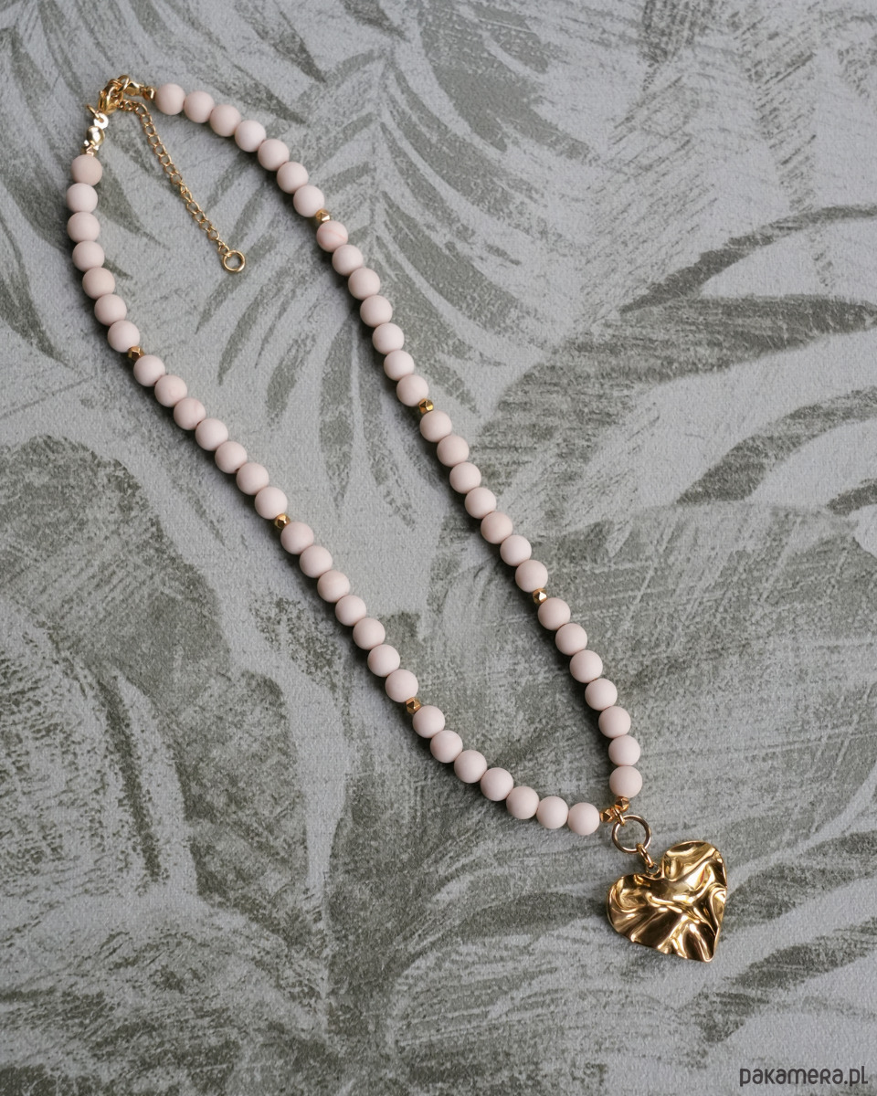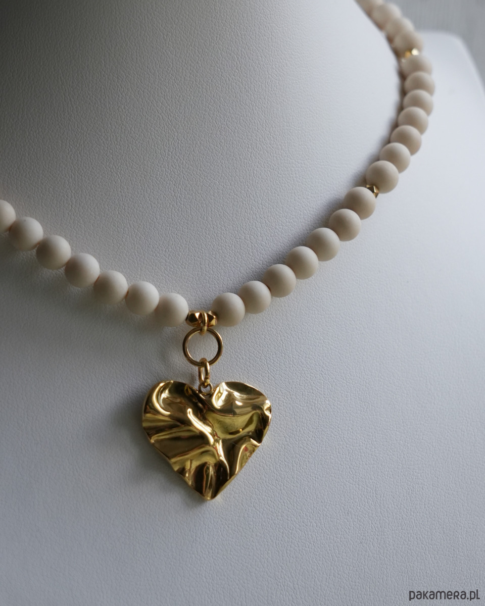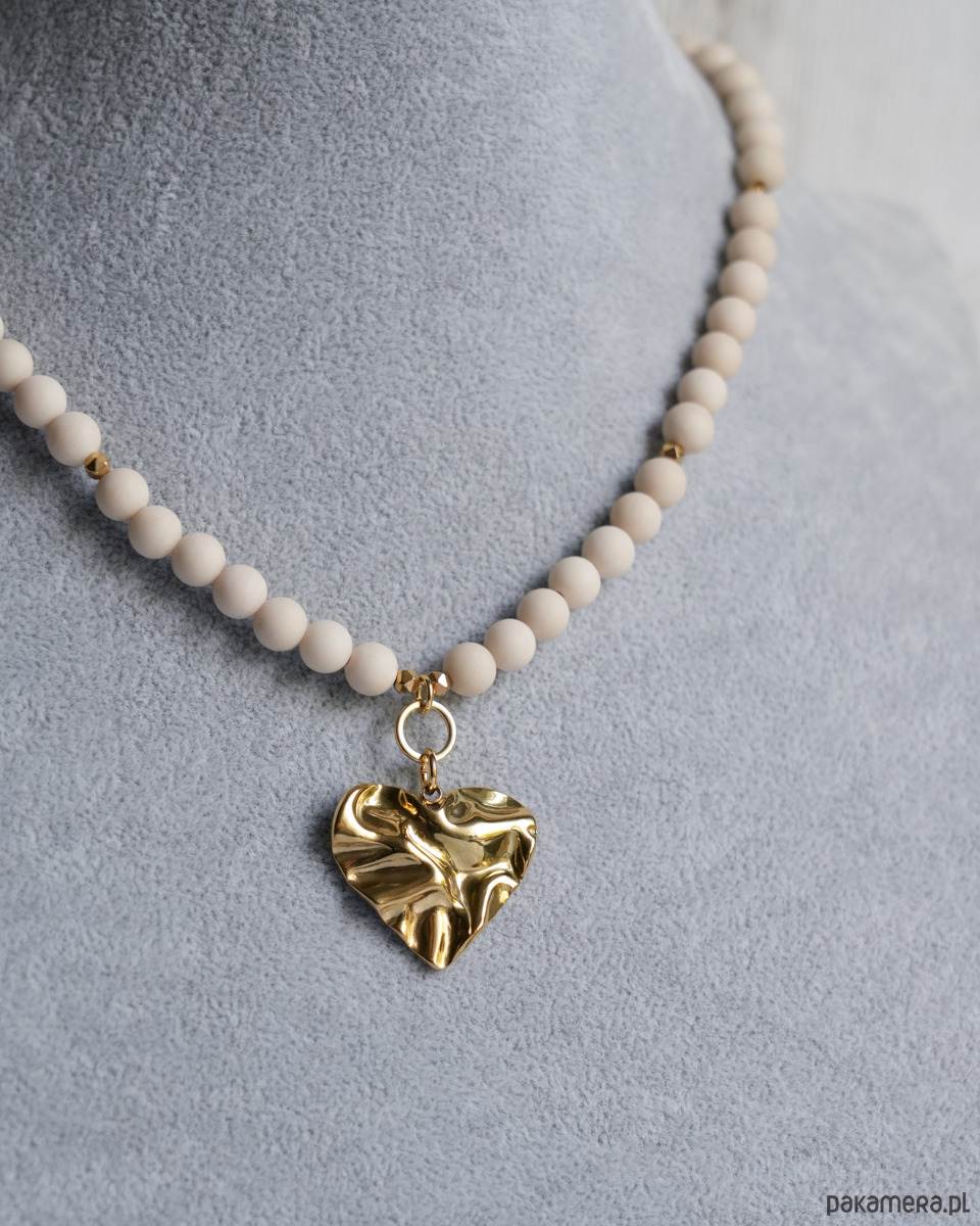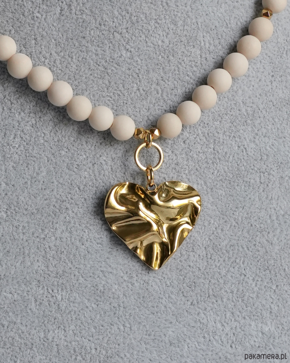 Beżowy naszyjnik choker na lato z matowego KAMIENIA RZECZNEGO i złotego HEMATYTU, z masywną zawieszką w kształcie serca o nieregularnej, gniecionej fakturze. Zawieszka, zapięcie i łańcuszek to STAL SZLACHETNA w kolorze złotym.