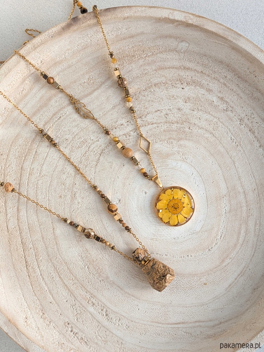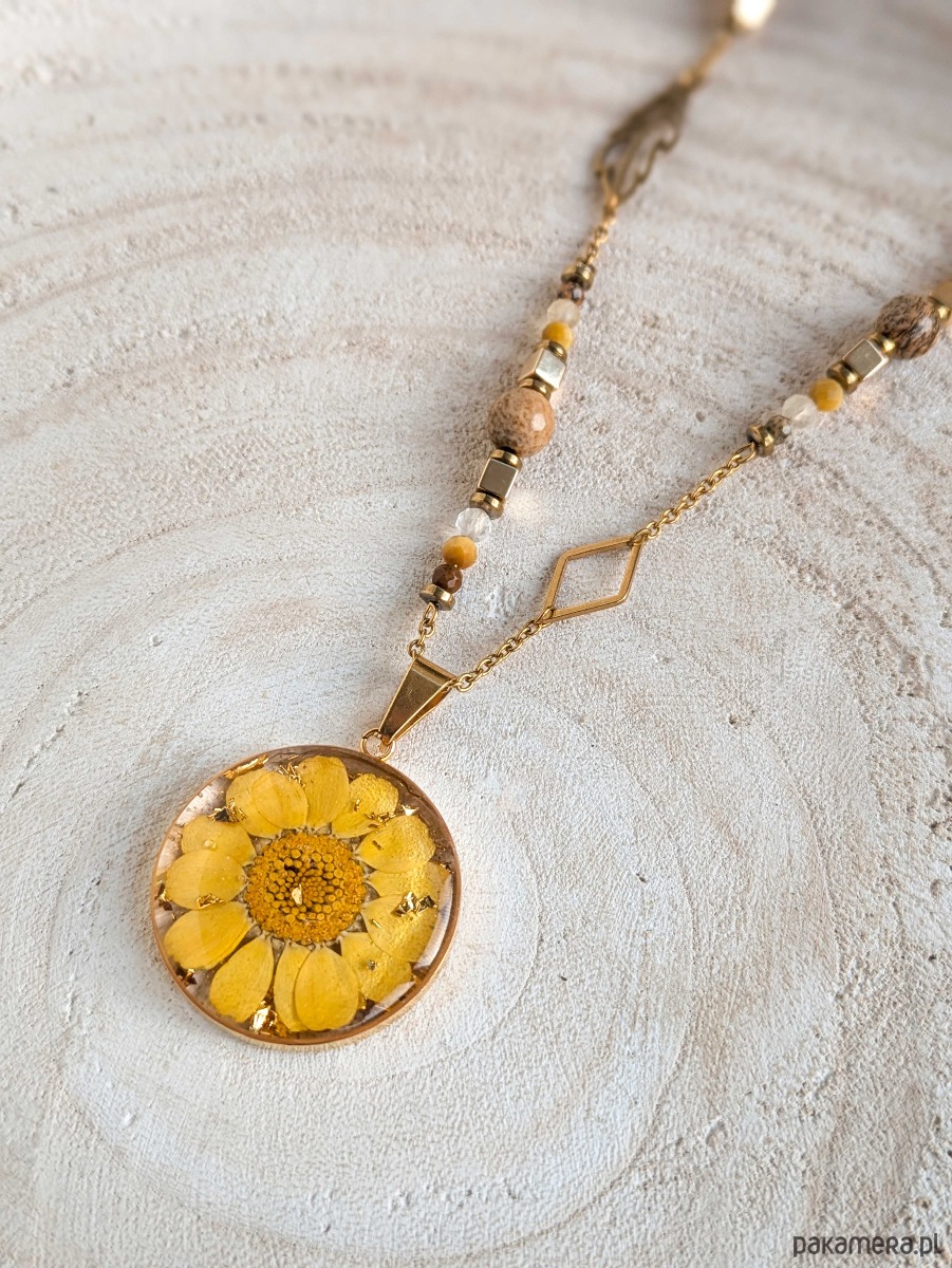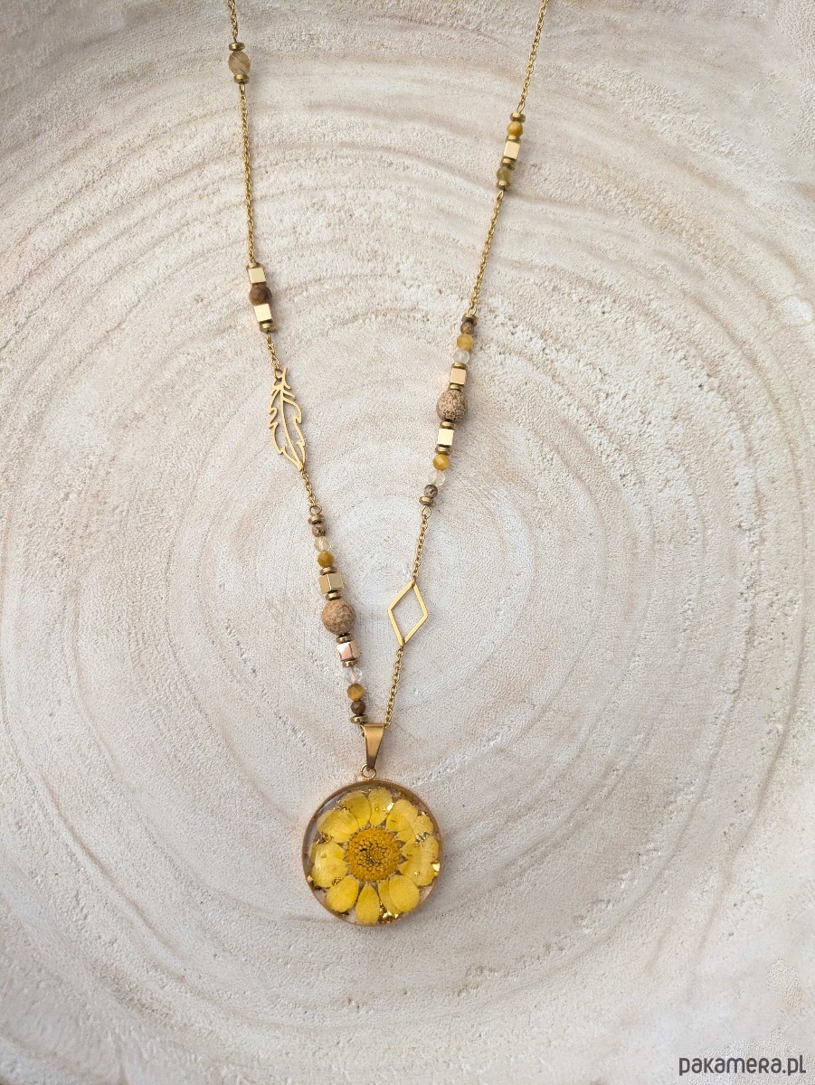 Naszyjnik wykonany ze stali chirurgicznej w kolorze złotym. Łańcuszek zdobią kamienie: jaspis krajobrazowy, hematyt, cytryn, tygrysie oko, kryształ górski oraz piórko i rąb. Zawieszka jest wykonana z żywicy w której został zatopiony żólty słoneczny kwiat i złote drobiny.