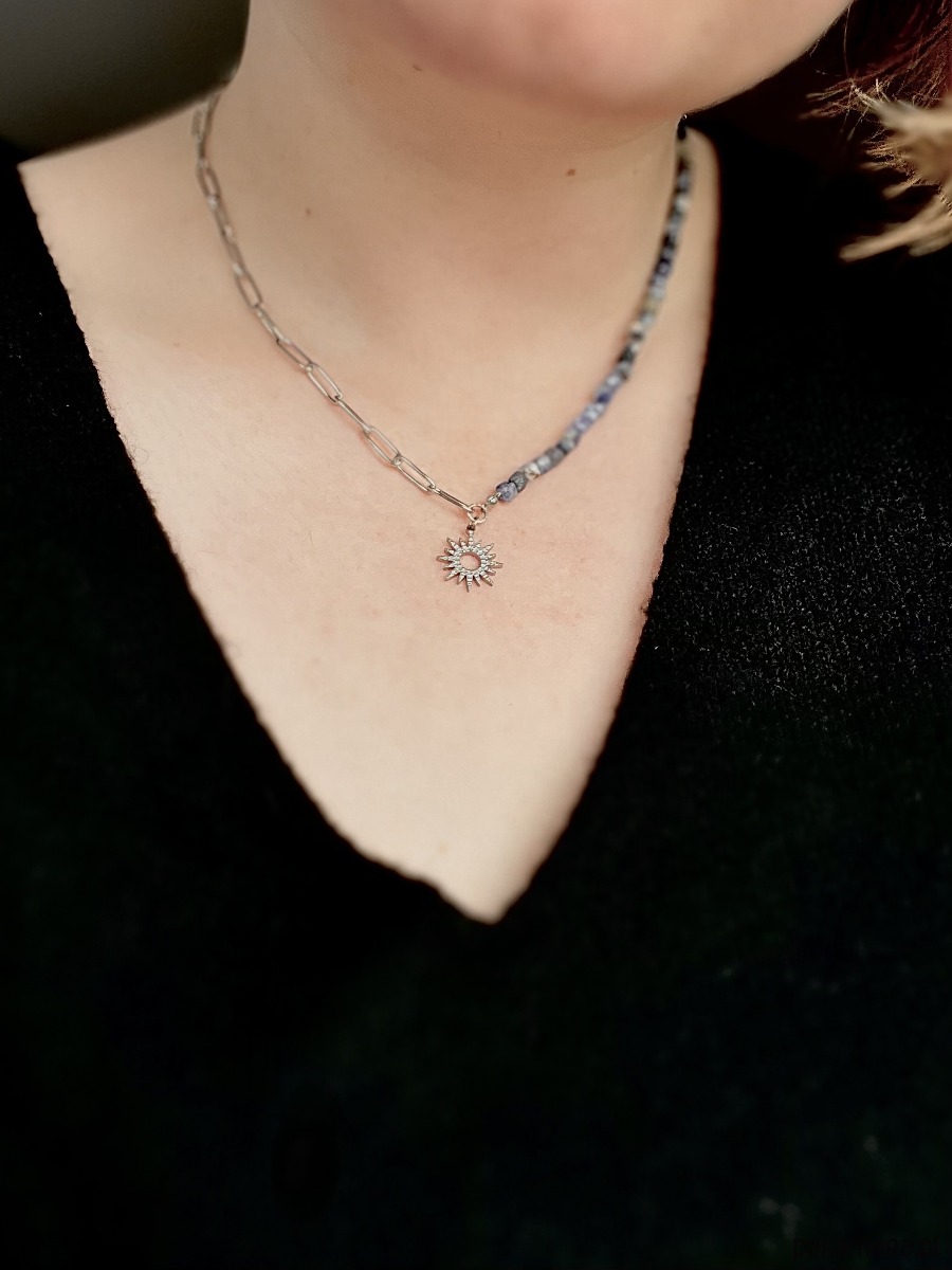 Naszyjnik z koralikami z kamieni naturalnych i zawieszką słońcem.