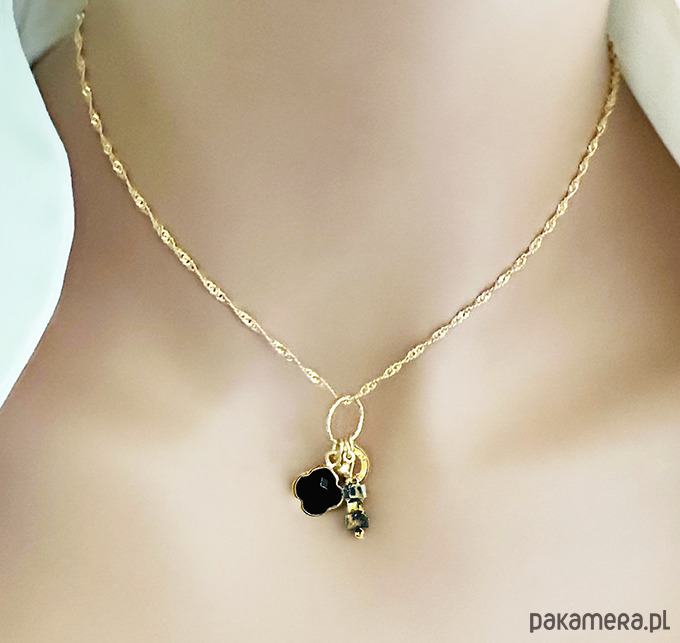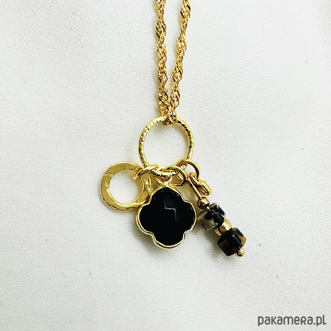 Ten piękny, delikatny naszyjnik przyciąga spojrzenia dzięki wyjątkowemu połączeniu naturalnych kamieni. Zawieszka z czarnego onykstu, oprawionego w kształt koniczyny — symbolu szczęścia i ochrony — oraz druga zawieszka z jaspisu dalmatyńskiego, znanego ze swoich unikalnych, cętkowanych wzorów, tworzą harmonijną, boho- elegancką kompozycję.