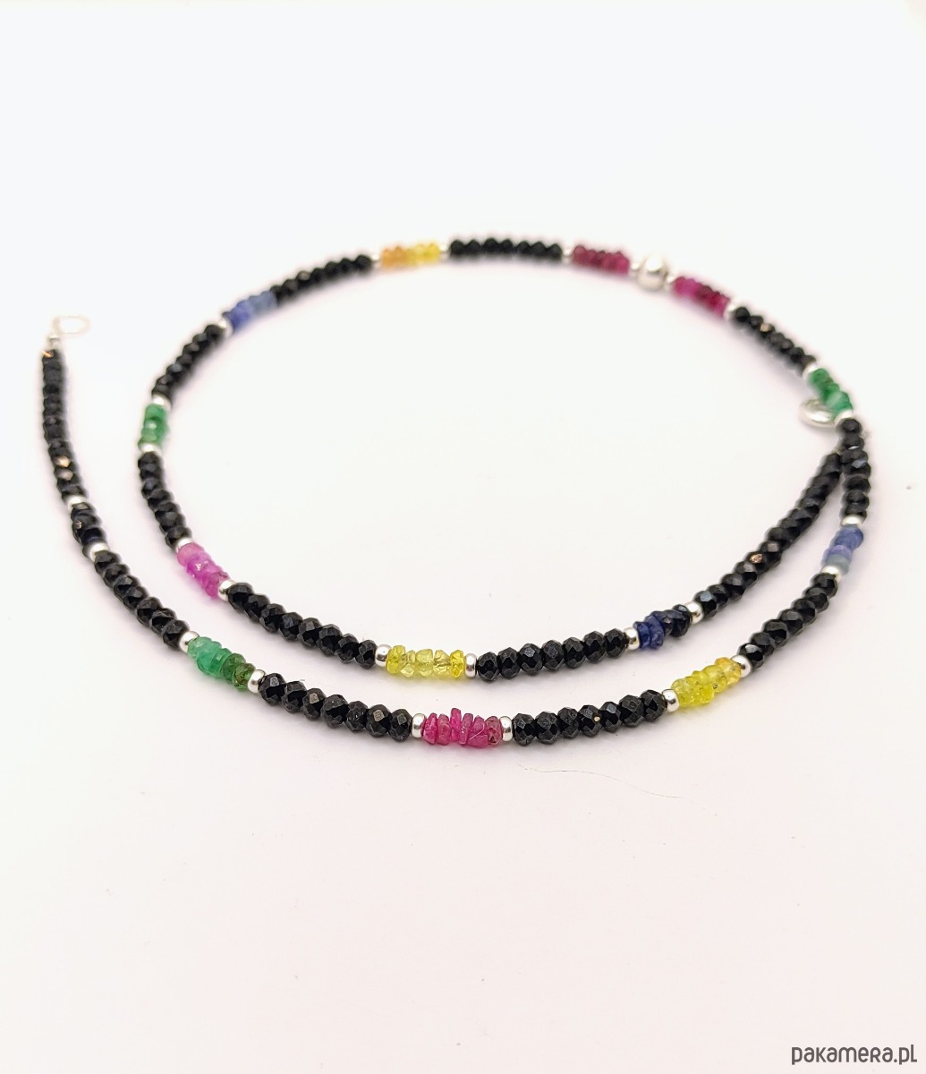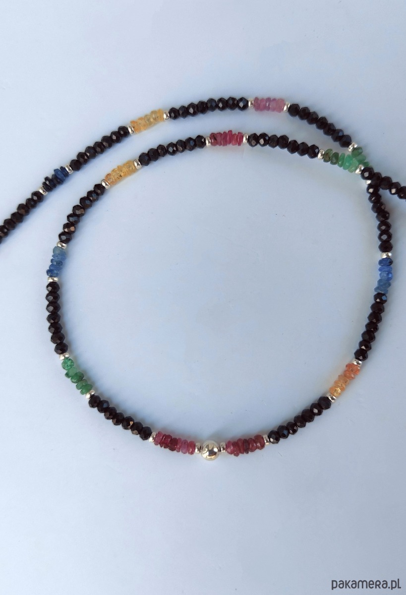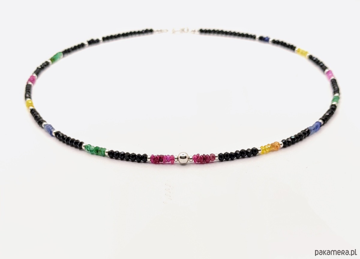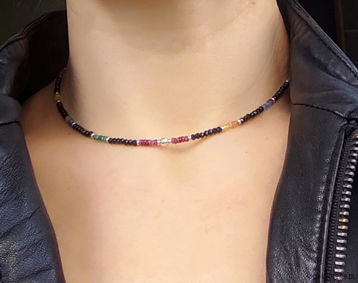 Naszyjnik krótki typu choker o wyjątkowym blasku. Został wykonany z kamieni szlachetnych: rubinu (róż), szafiru (błękit, granat i żółty), szmaragdu (zielony) oraz spinelu (czarny). Spinel w kształcie oponek jest szlifowany w sposób eksponujący niesamowite lśnienie tego kamienia. Pozostałe, kolorowe kamienie mają nasycone barwy, są częściowo transparentne, dzięki czemu pięknie przepuszczają światło. Naszyjnik jest delikatny, ale dzięki migotaniu szlachetnych kamieni wywołuje efekt WOW. Wykończony srebrem z próbą probierczą 925.