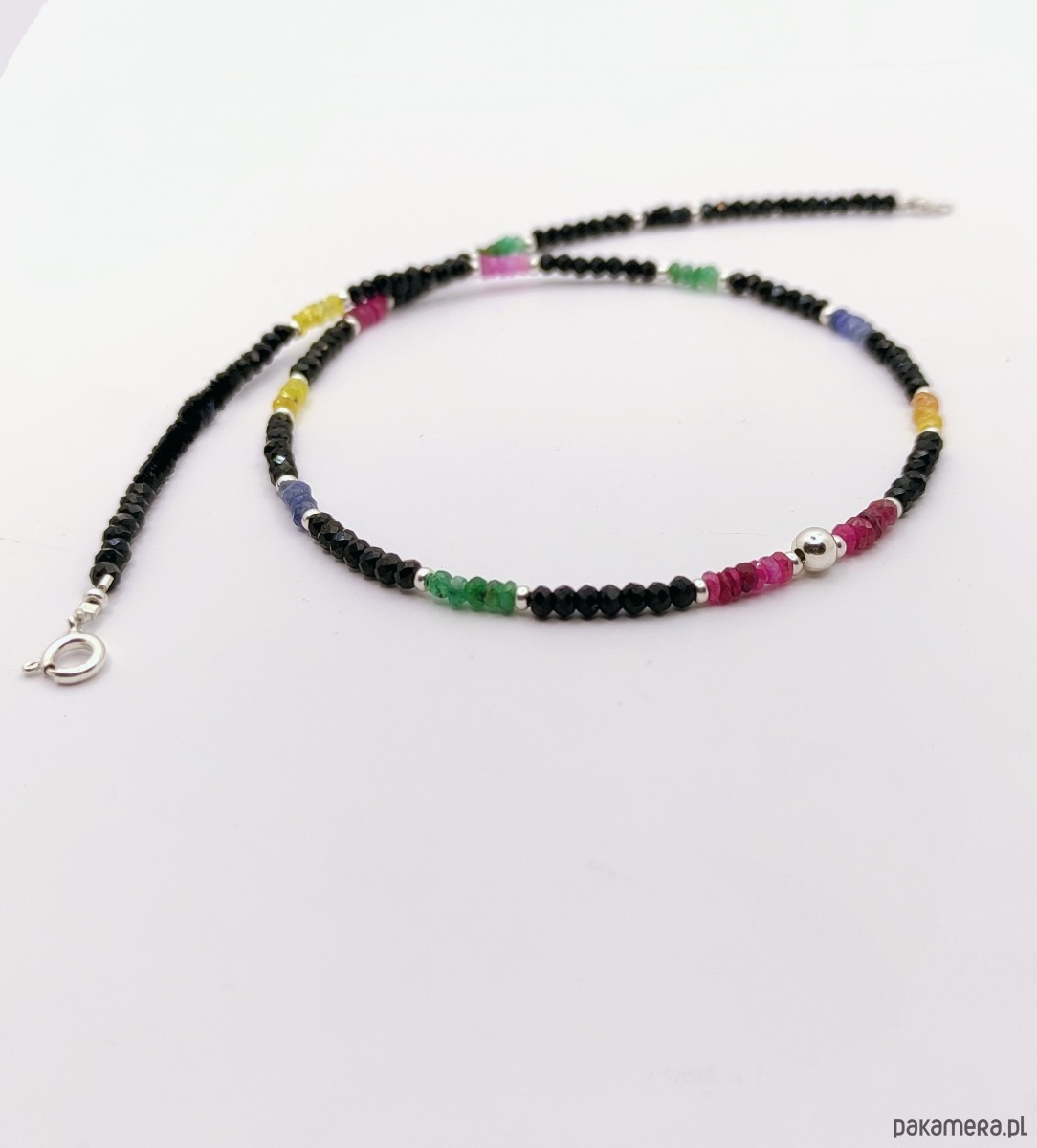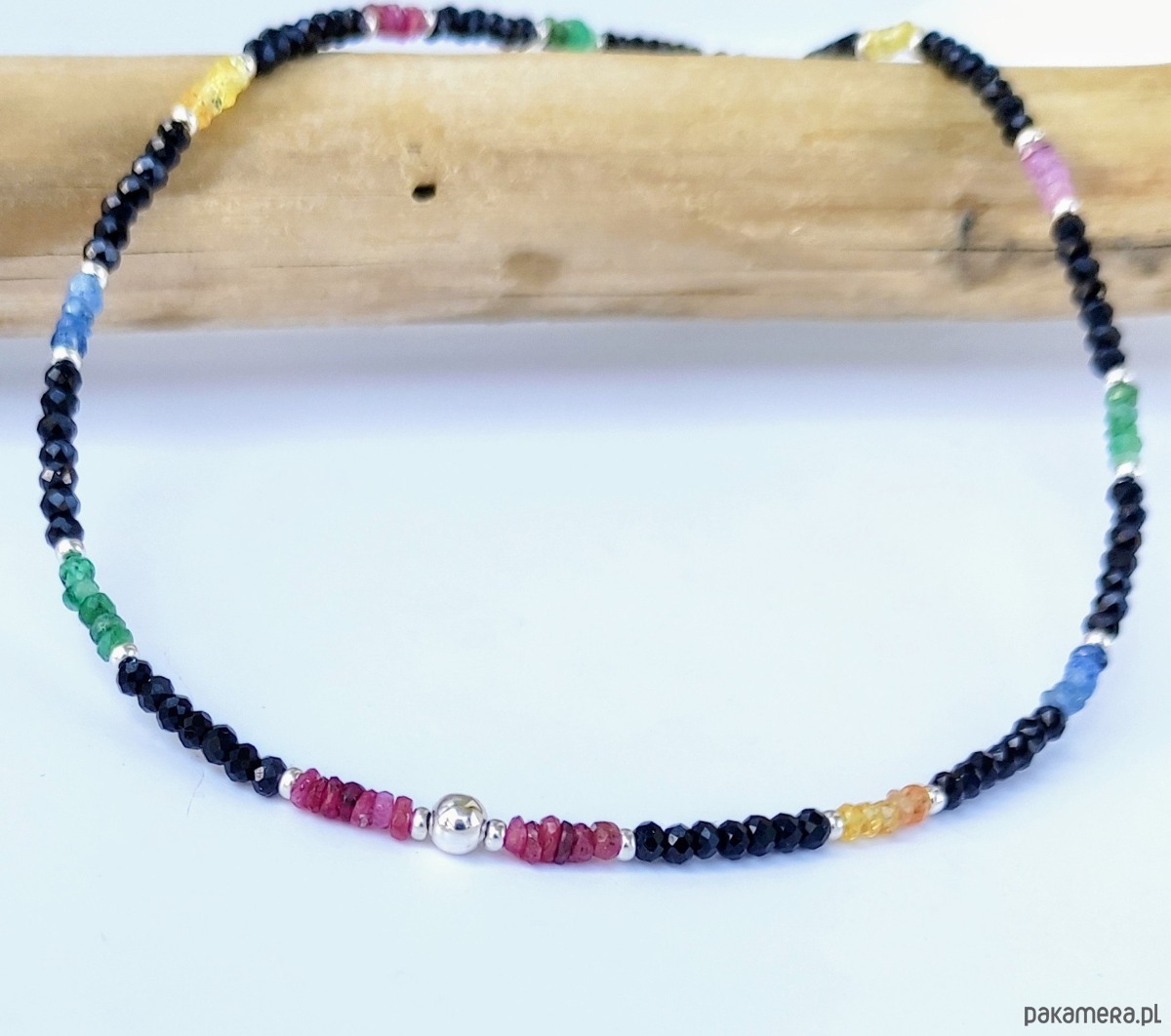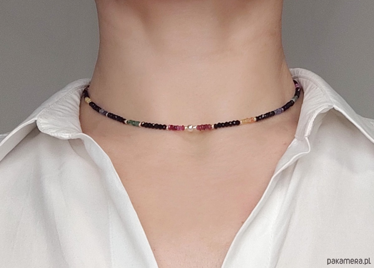 Naszyjnik krótki typu choker o wyjątkowym blasku. Został wykonany z kamieni szlachetnych: rubinu (róż), szafiru (błękit, granat i żółty), szmaragdu (zielony) oraz spinelu (czarny). Spinel w kształcie oponek jest szlifowany w sposób eksponujący niesamowite lśnienie tego kamienia. Pozostałe, kolorowe kamienie mają nasycone barwy, są częściowo transparentne, dzięki czemu pięknie przepuszczają światło. Naszyjnik jest delikatny, ale dzięki migotaniu szlachetnych kamieni wywołuje efekt WOW. Wykończony srebrem z próbą probierczą 925.