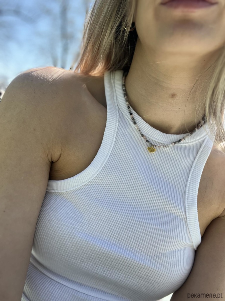 Naszyjnik z kamieni ma około 40 cm + 5cm łańcuszka, by móc sobie regulować jego obwód.