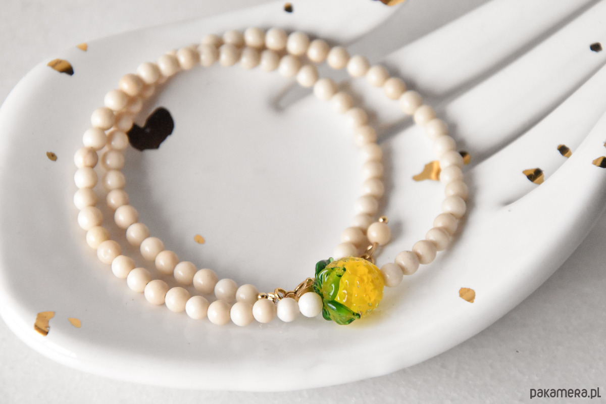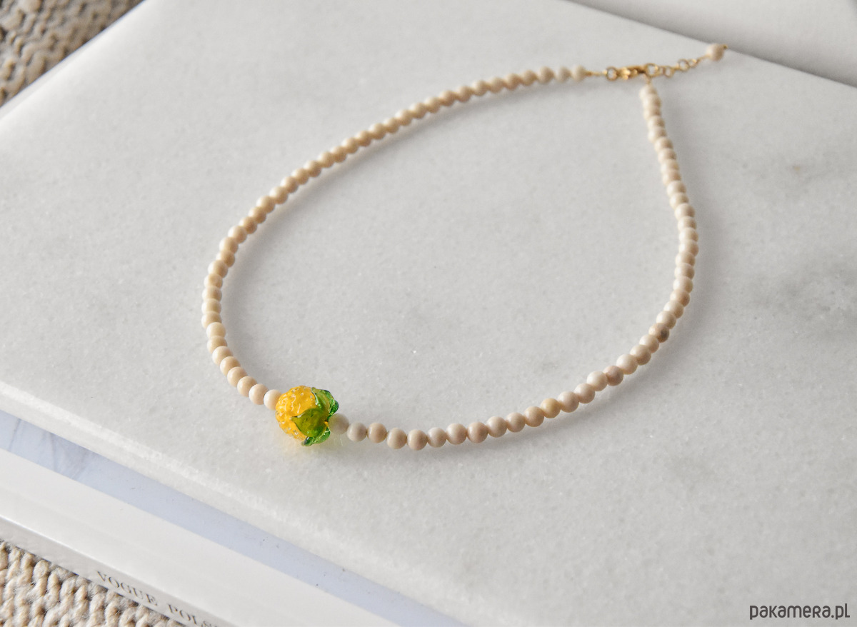 Naszyjnik z tradycyjnym zapięciem, wykonany ręcznie z kamieni naturalnych ze szklaną cytrynką. Użyty w niej kamień rzeczny ma wiele właściwości.