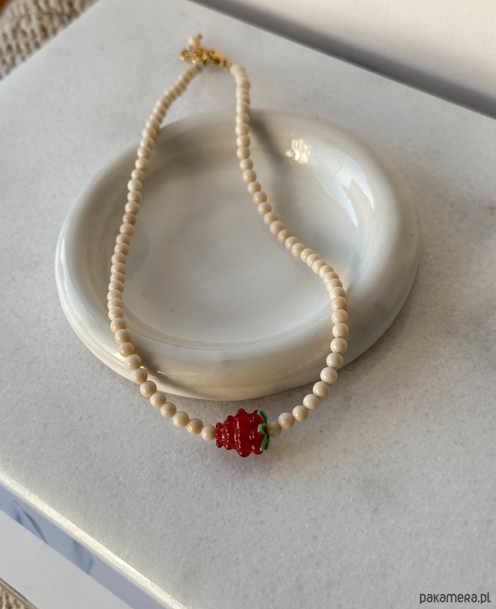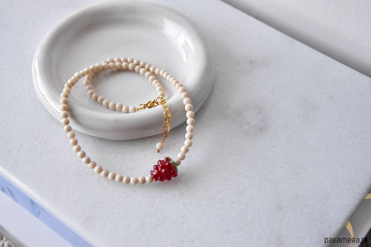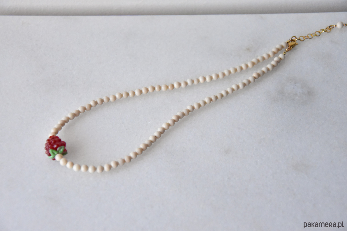 Materiał: kamień rzeczny, ceramiczna malinka, stal szlachetna, żyłka jubilerska