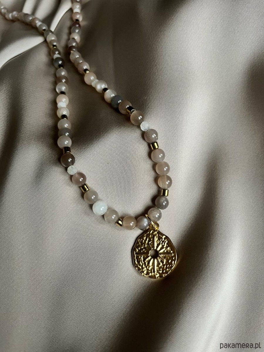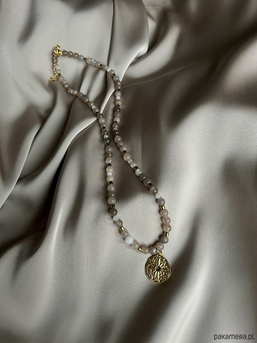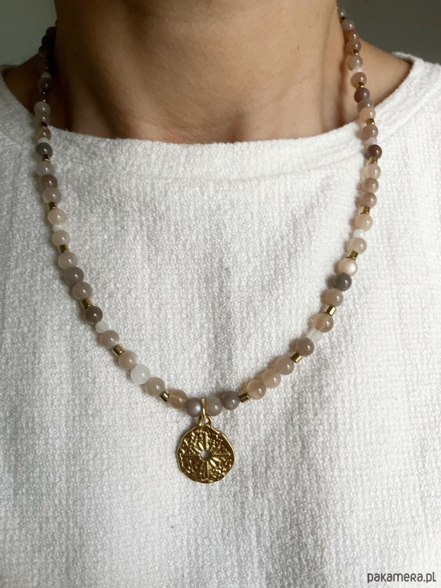 Delikatny, kobiecy naszyjnik z **kamieniem słonecznym**, hematytami oraz elementami ze **stali szlachetnej**.