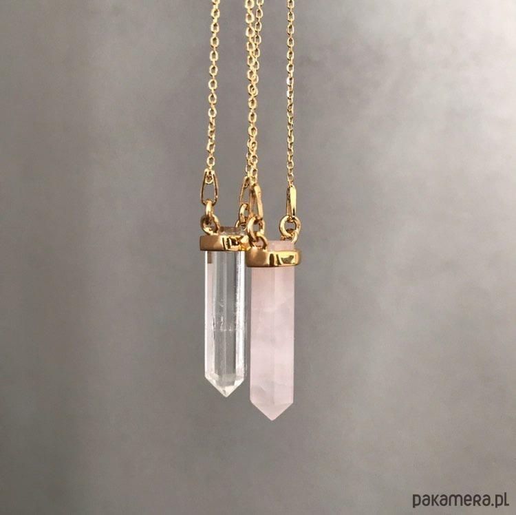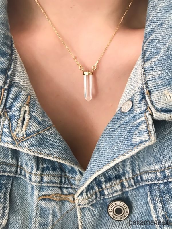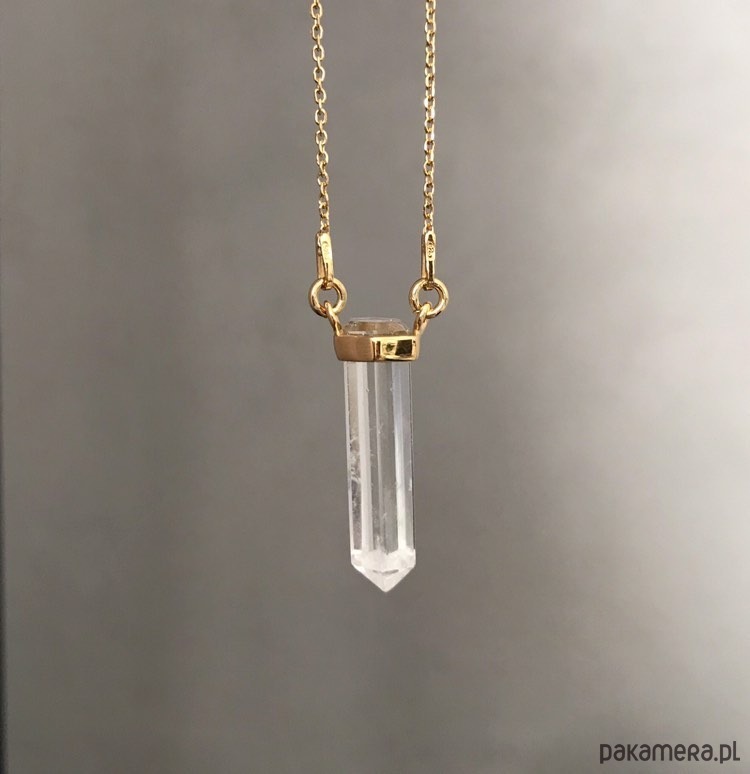 Naszyjnik kryształ górski w oprawie MINI. Kryształ okuty w srebro próby 925, pozłacany. Każda sztuka jest wyjątkowa - kamienie delikatnie różnią się kształtem, wielkością i przejrzystością. Wymiary kamienia: ok. 2,5 x 0,6 cm.