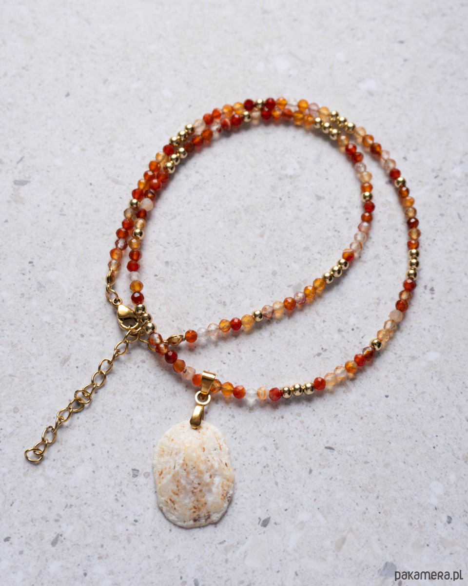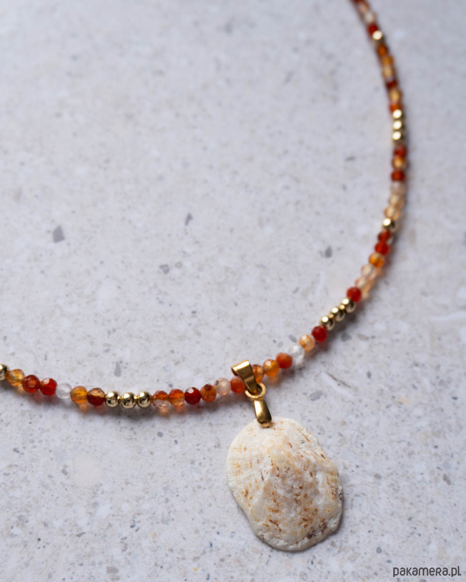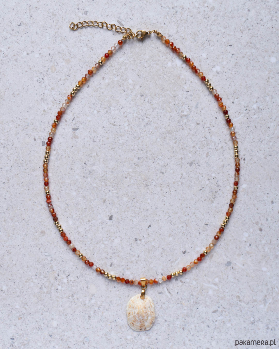 Naszyjnik z karneolu z zawieszką muszelką. Naszyjnik wykonany z kamienia naturalnego, zapięcia i przekładki ze stali chirurgicznej w kolorze złotym.