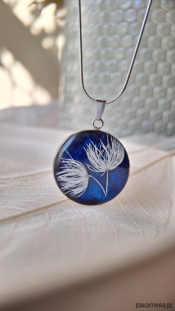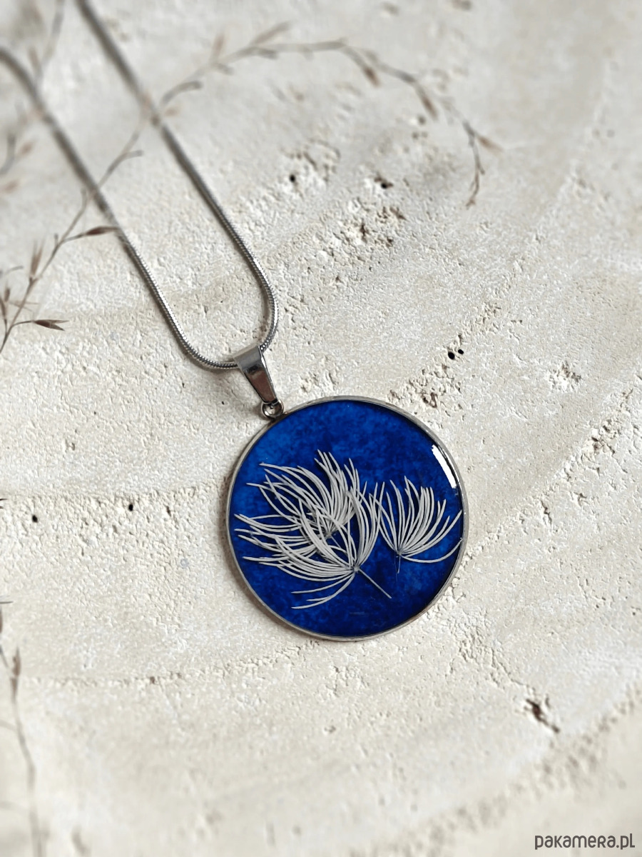 Odkryj subtelne piękno natury z naszyjnikiem z kolekcji Ventus. W tym wyjątkowym projekcie delikatna biała trawa została zatopiona na tle głębokiego, granatowego odcienia, tworząc miniaturowe dzieło sztuki. Granatowa akwarela, nakładana ręcznie z dbałością o każdy detal, przypomina bezkresne nocne niebo, na którym lśni subtelna biel trawy. Każdy naszyjnik jest niepowtarzalny, dzięki unikalnemu układowi źdźbeł trawy i niuansom barw akwareli. Do stworzenia tła użyto najwyższej jakości japońskich farb akwarelowych z naturalnymi pigmentami, co gwarantuje trwałość i głębię koloru.