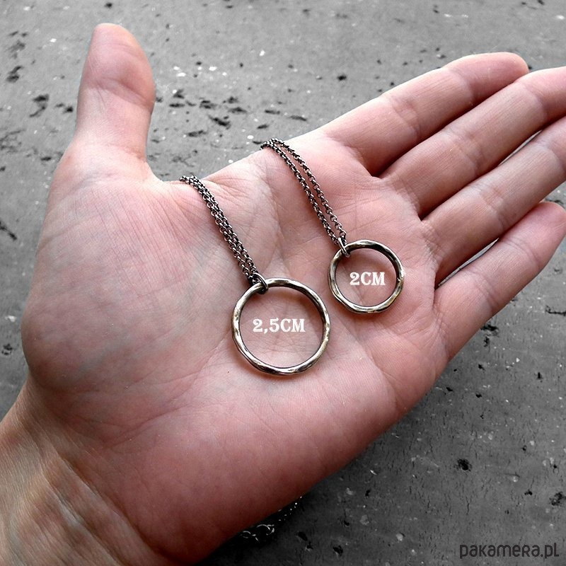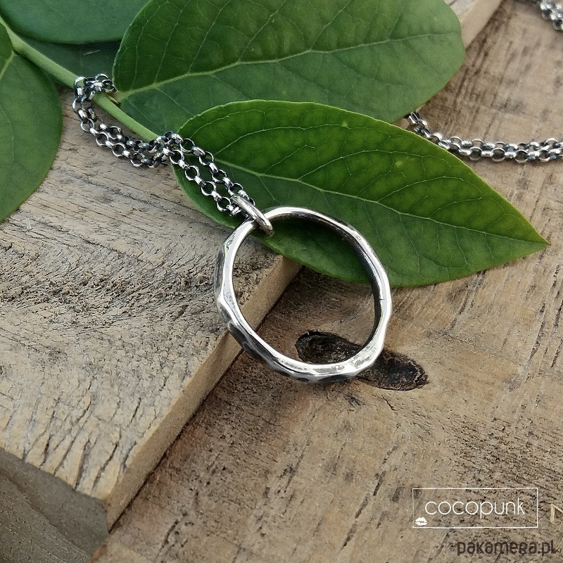 Kobiecy naszyjnik w stylu minimalistycznym. Wykonany ze srebra pr. 925 (oksydowanego i polerowanego). Zdobi go: -ręcznie kute i młotkowane koło wielkości 2 cm. Naszyjnik jest bardzo ciekawy, widoczny, ma naturalną surową formę. Długość łańcuszka wynosi 44cm plus 4cm łańcuszka przedłużki. Całkowita długość wisiorka wynosi 2,2cm. Biżuteria dotrze do Państwa elegancko zapakowana. W ofercie posiadam również naszyjnik z większym kółeczkiem.