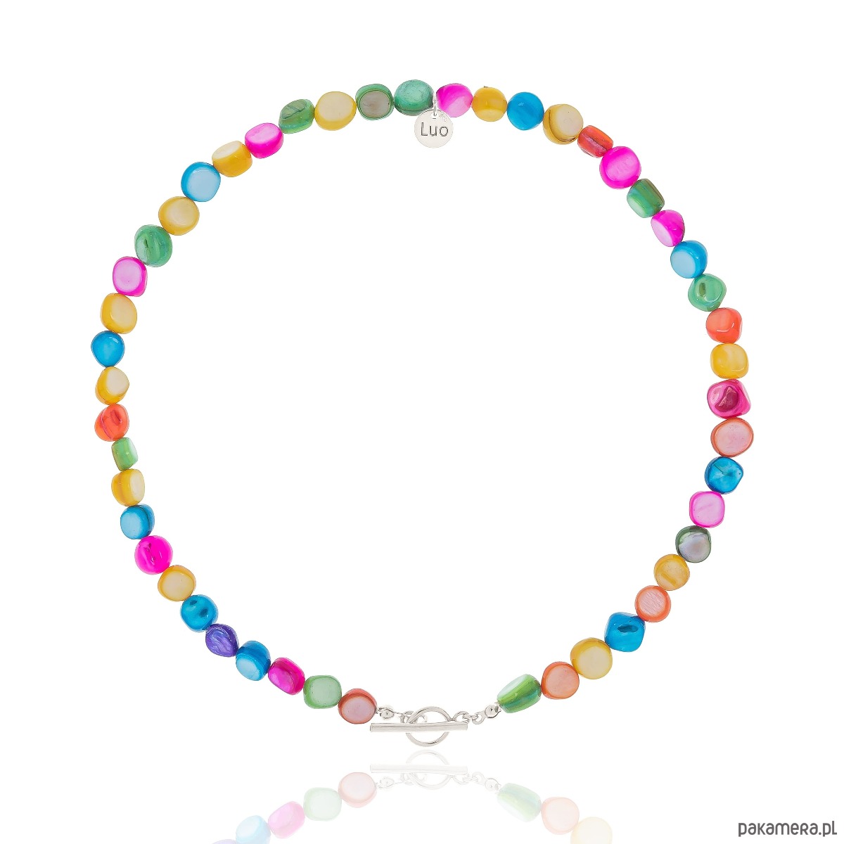 Naszyjnik z kolorowej masy perłowej z ozdobnym zapięciem. Logo i zapięcie toggle wykonane ze srebra 925.