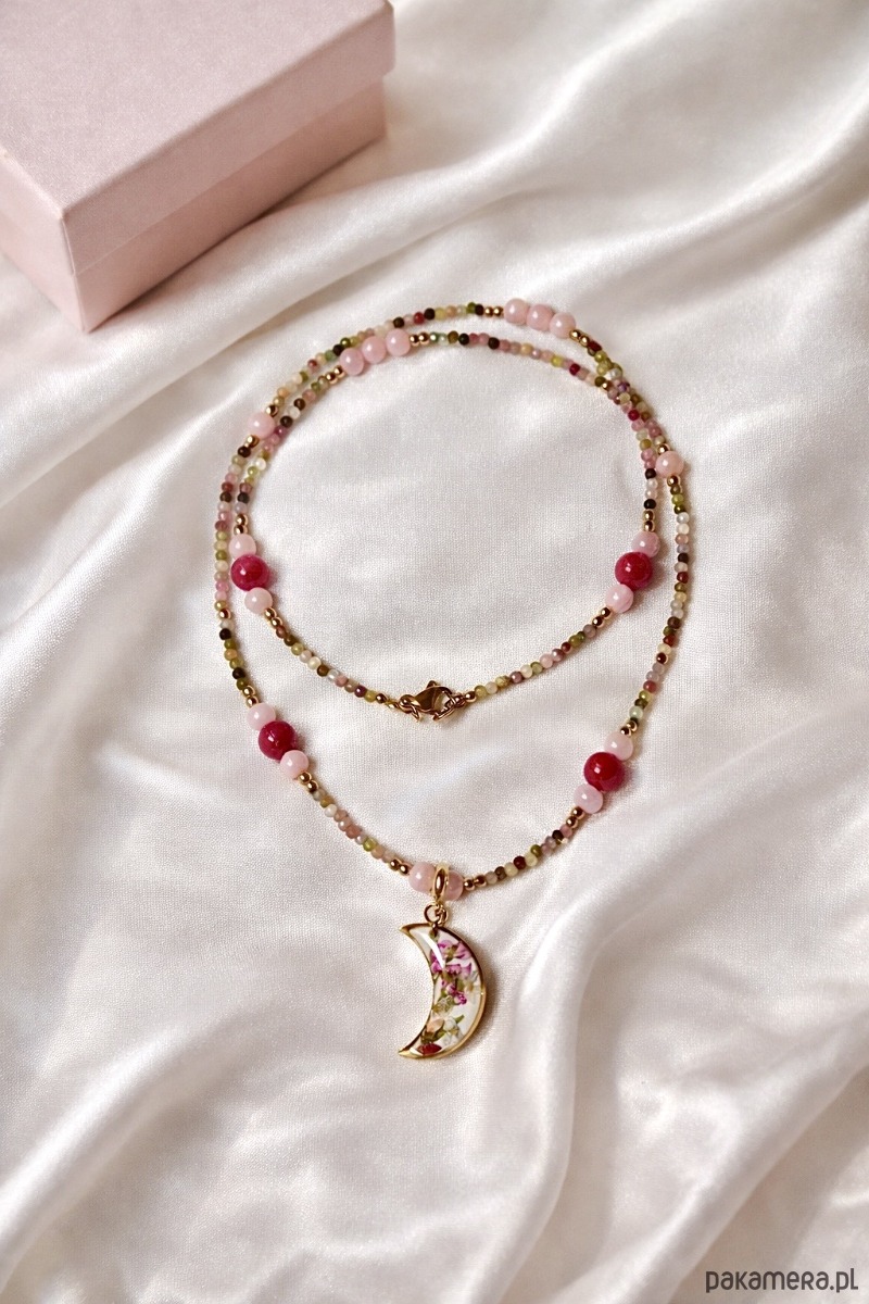 Naszyjnik z kolorowymi turmalinami i księżycem z kwiatami