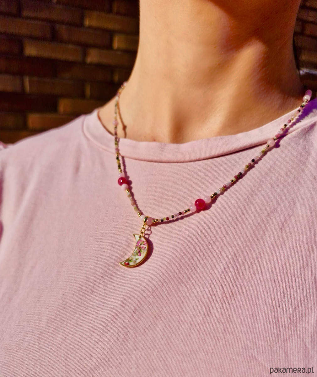 Sercem naszyjnika jest pozłacana zawieszka w kształcie półksiężyca, wypełniona prawdziwymi, suszonymi kwiatami zatopionymi w przezroczystej żywicy. To małe dzieło sztuki sprawia, że każdy egzemplarz jest niepowtarzalny – tak jak Ty