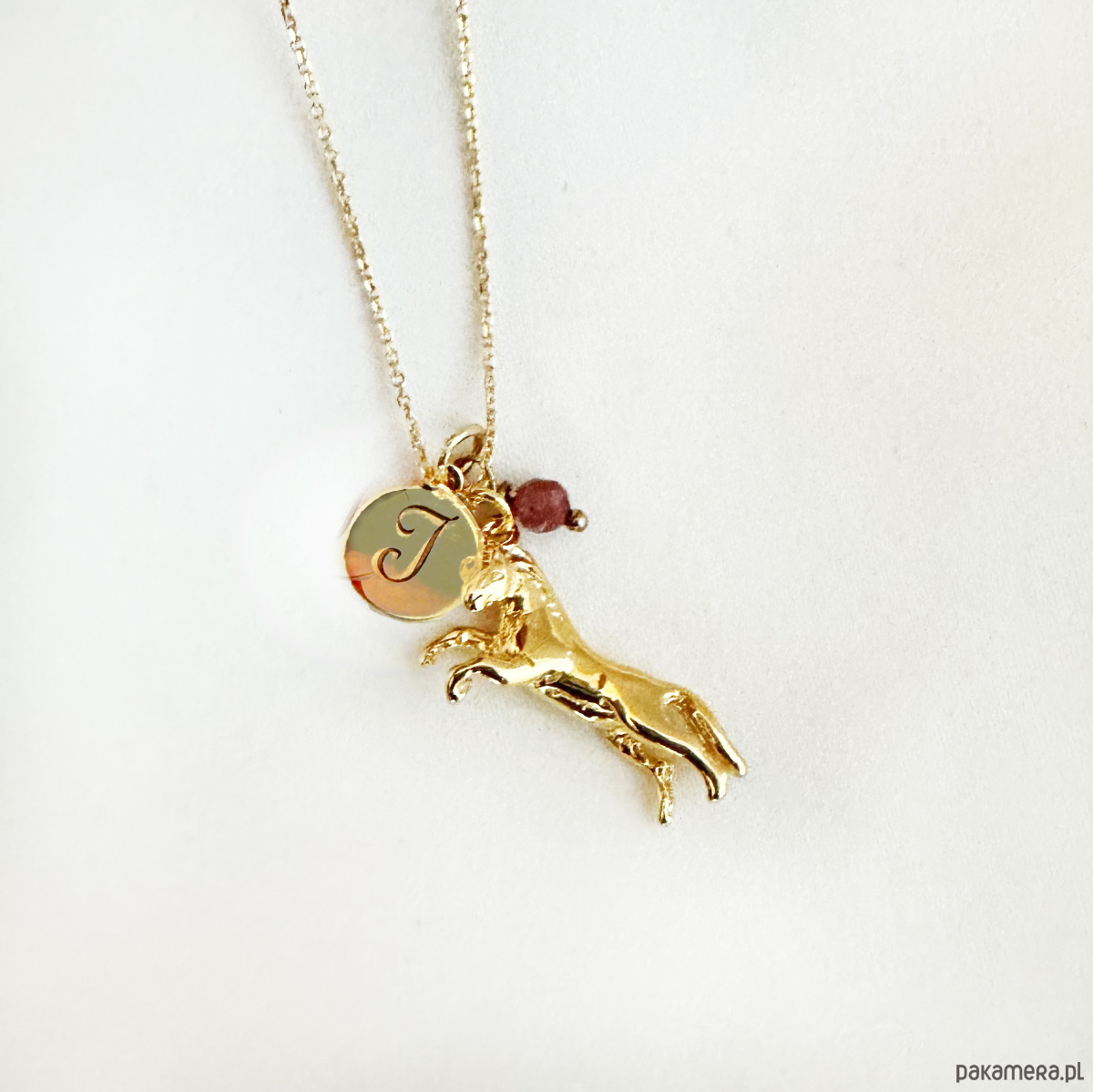 Delikatny naszyjnik z zawieszką w kształcie konika. Może być personalizowany literką i kamieniem.