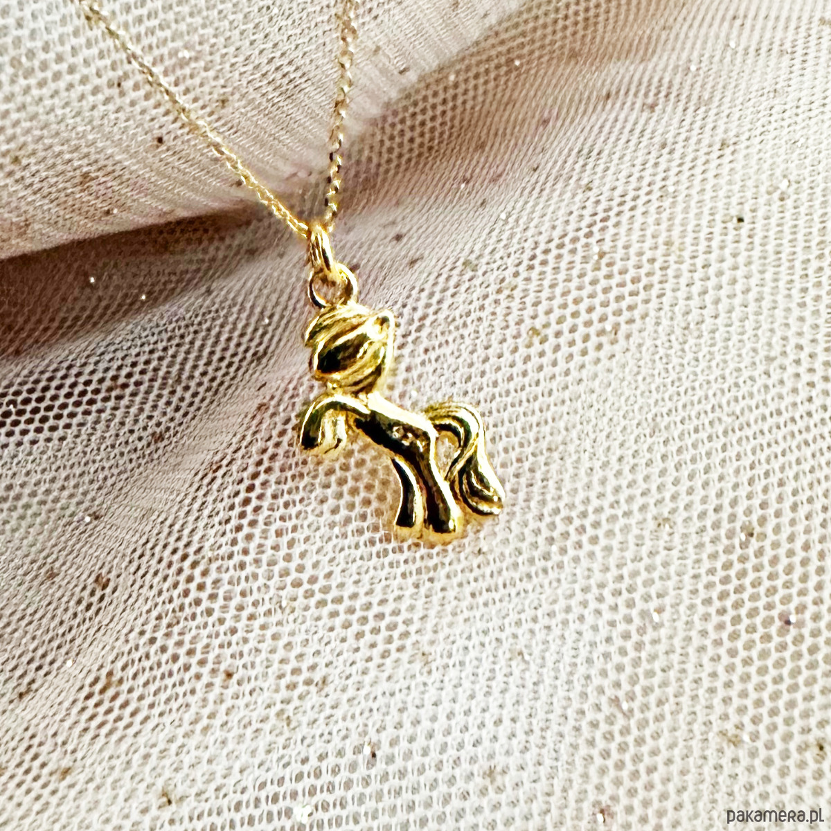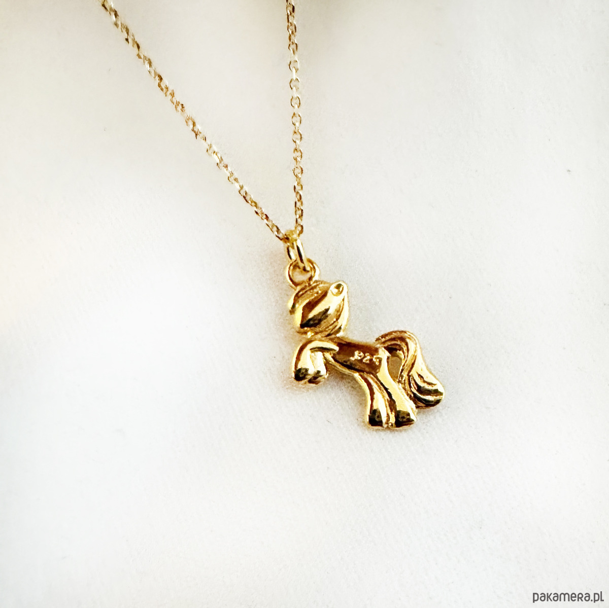 Naszyjnik z pięknym elementem w kształcie konik pony, złoty konik pony. Zawieszka jest dwustronna.Wykonany ze srebra próby 925 złocona 24 k złotem.