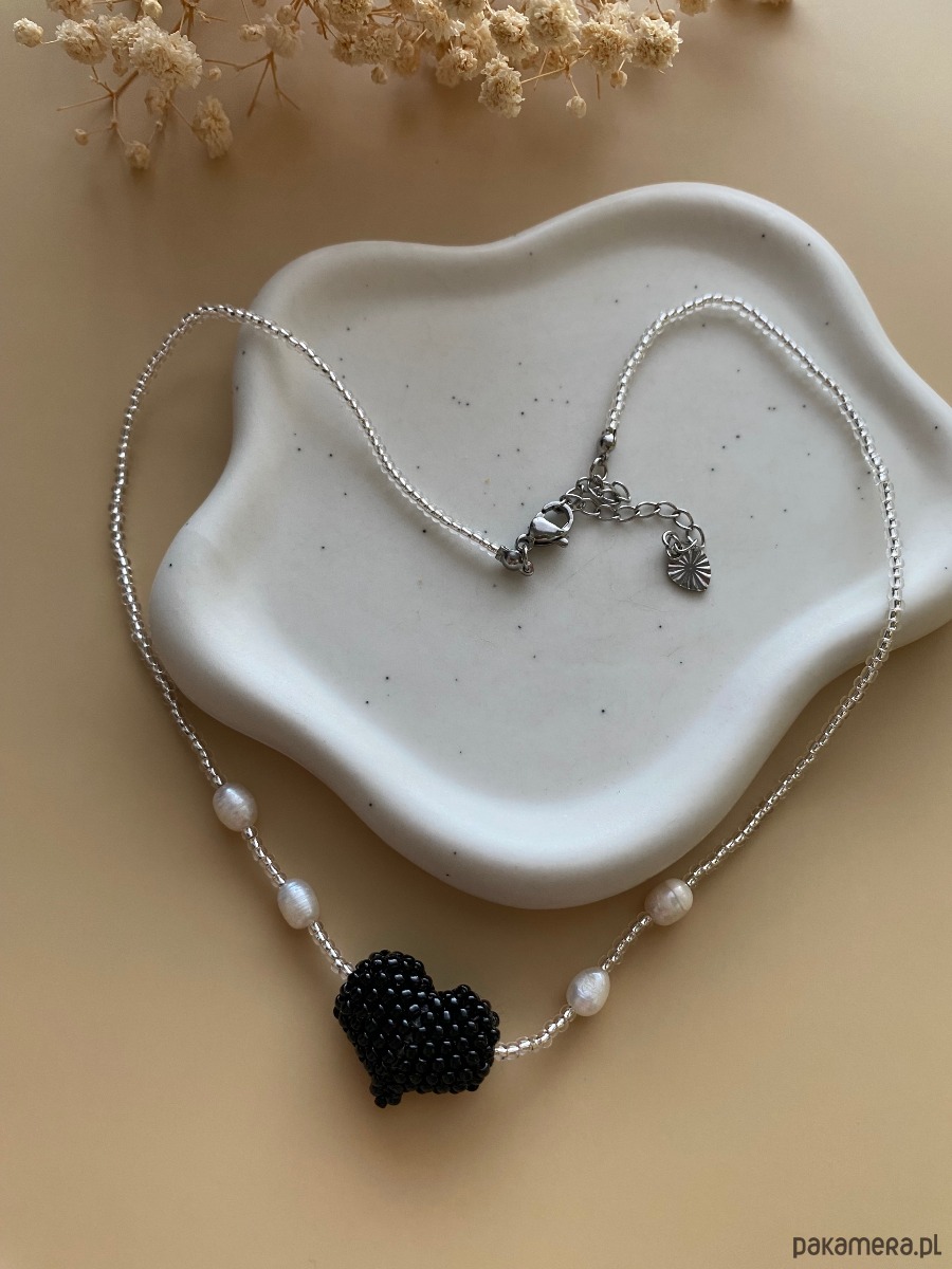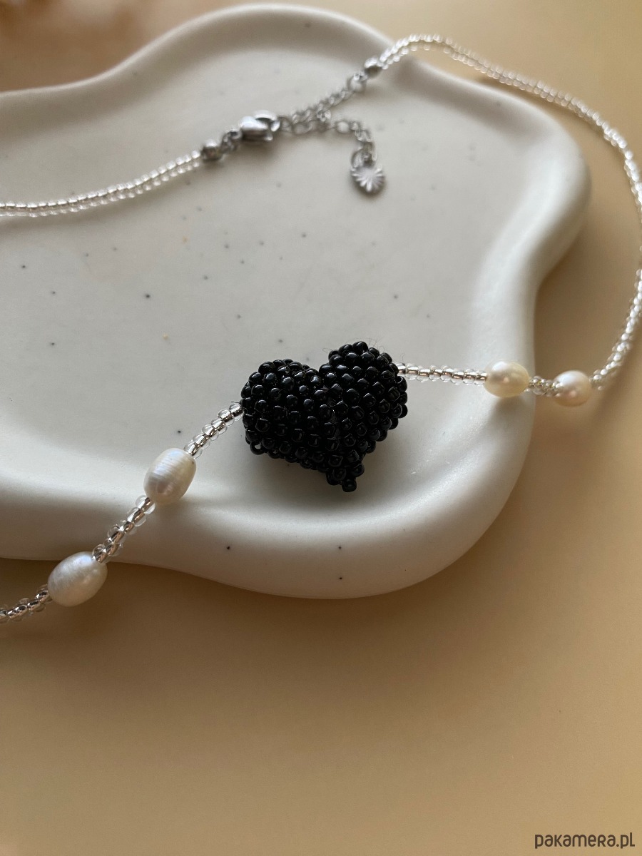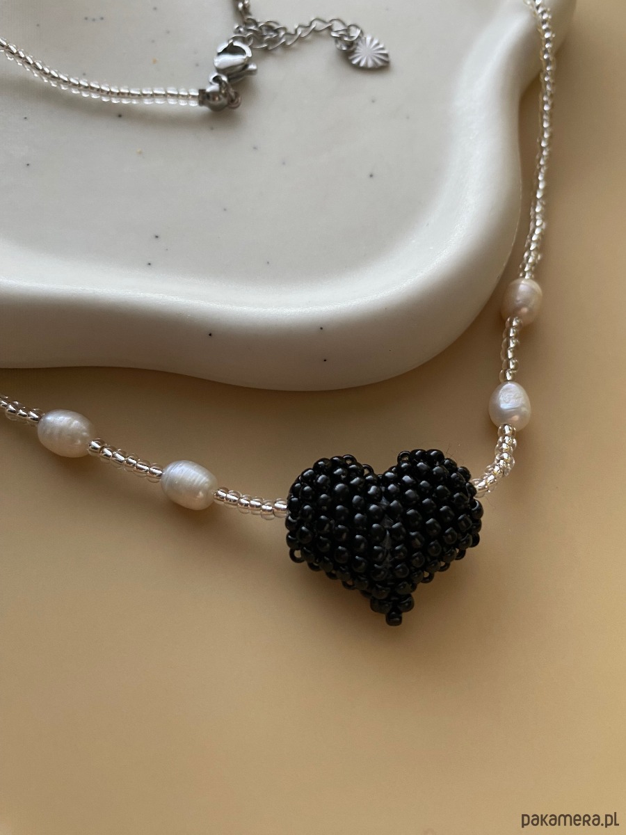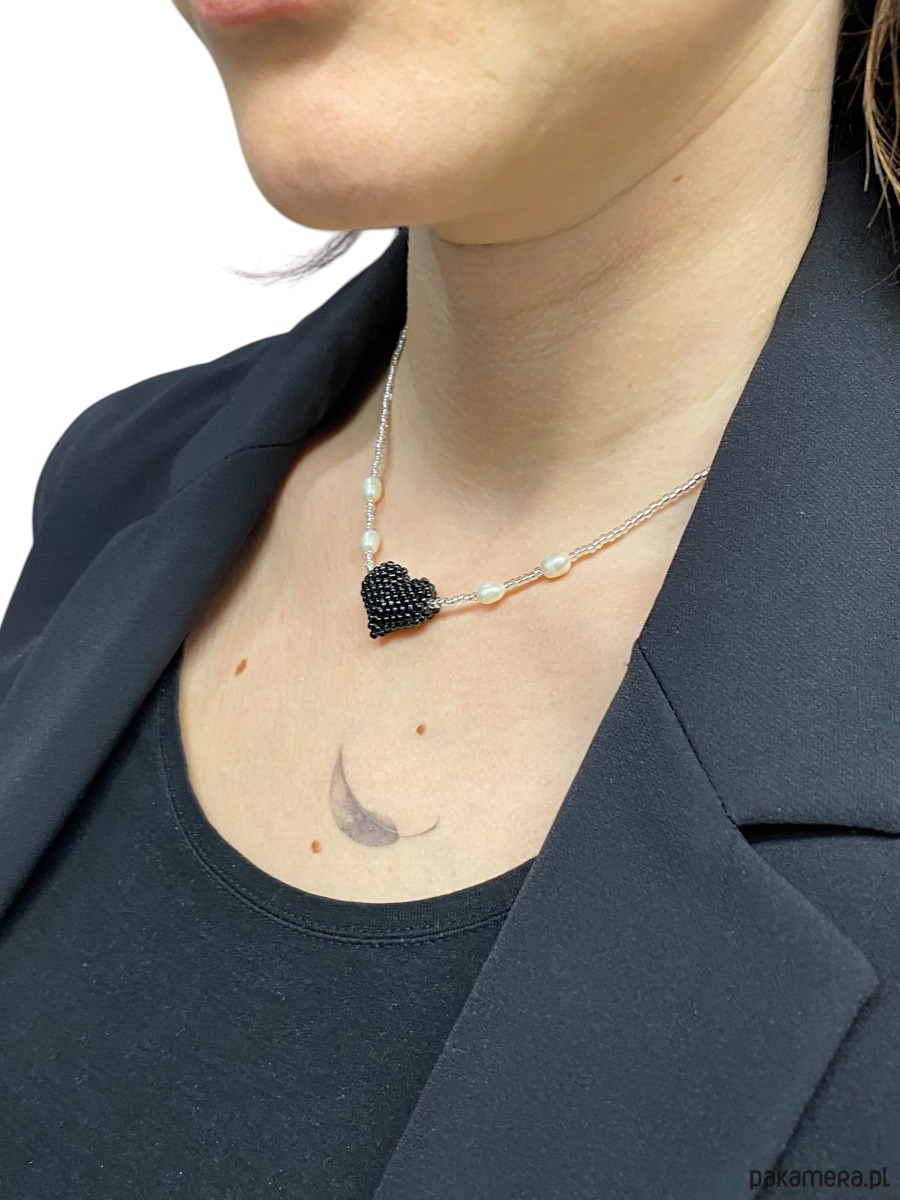 Nowoczesny, wyrazisty i wyjątkowy naszyjnik wykonany ze szklanych koralików Toho. Zawieszka w formie serduszka plecionego również z koralików. Dodatkowo 4 perełki hodowlane. Naszyjnik nawlekany na nić nylonową.