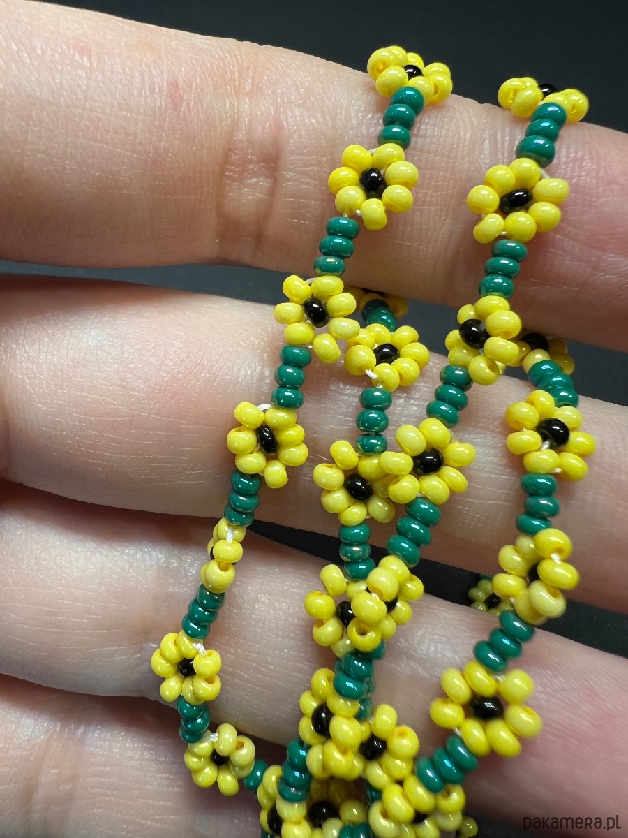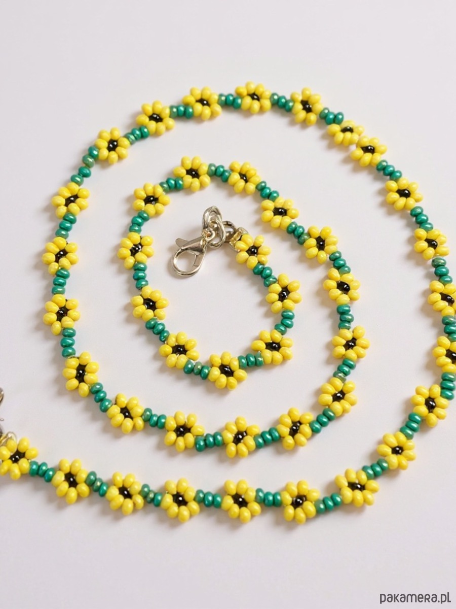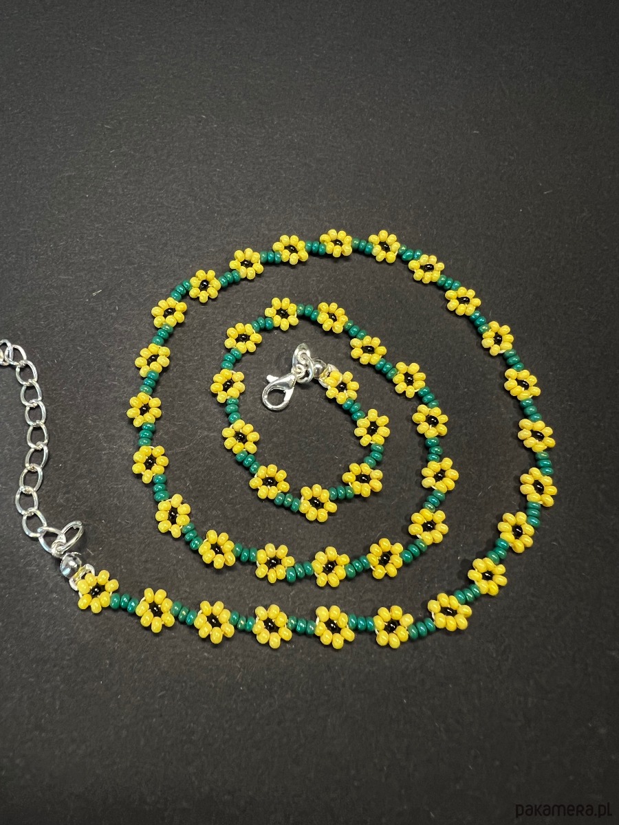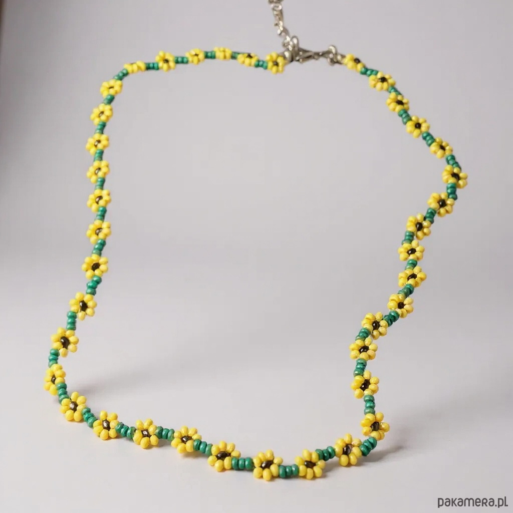 Ręcznie wykonany naszyjnik z drobnych koralików w kolorach żółtym i zielonym tworzy wzór delikatnych kwiatów – słoneczników. To lekka i urocza biżuteria, która doda świeżości każdej stylizacji.