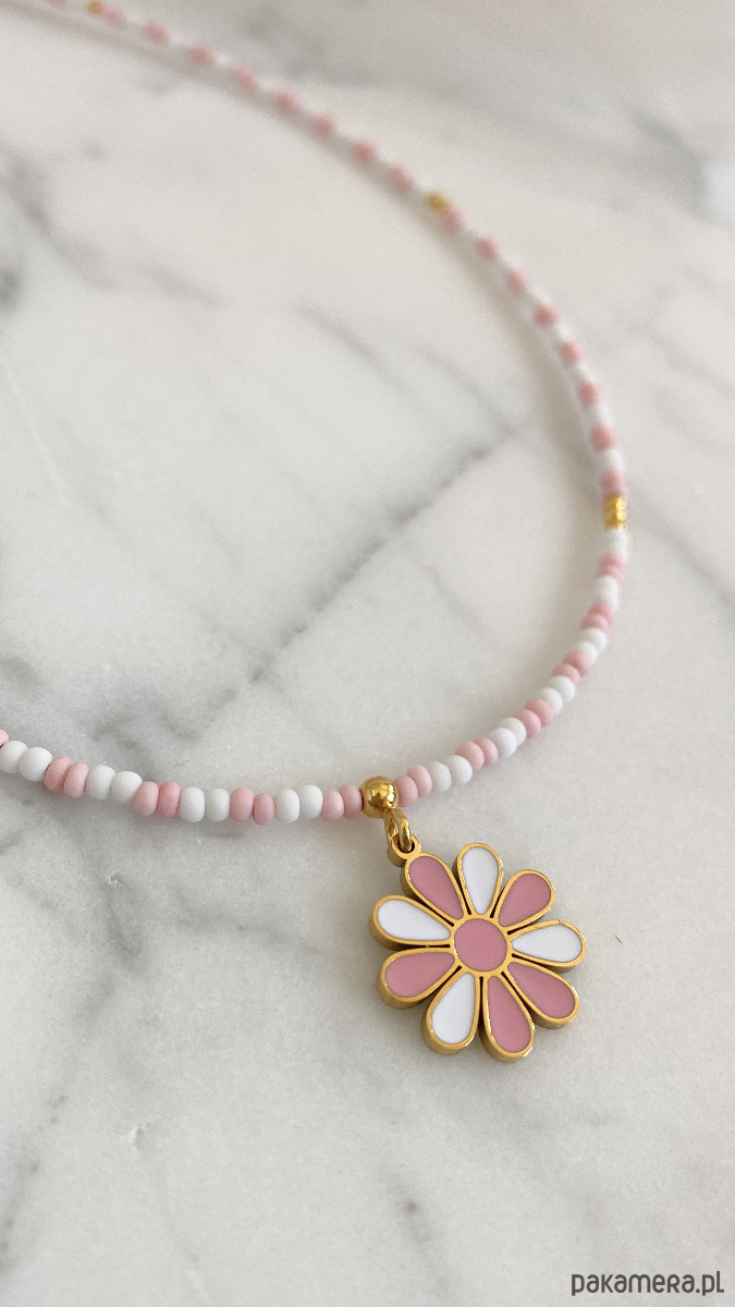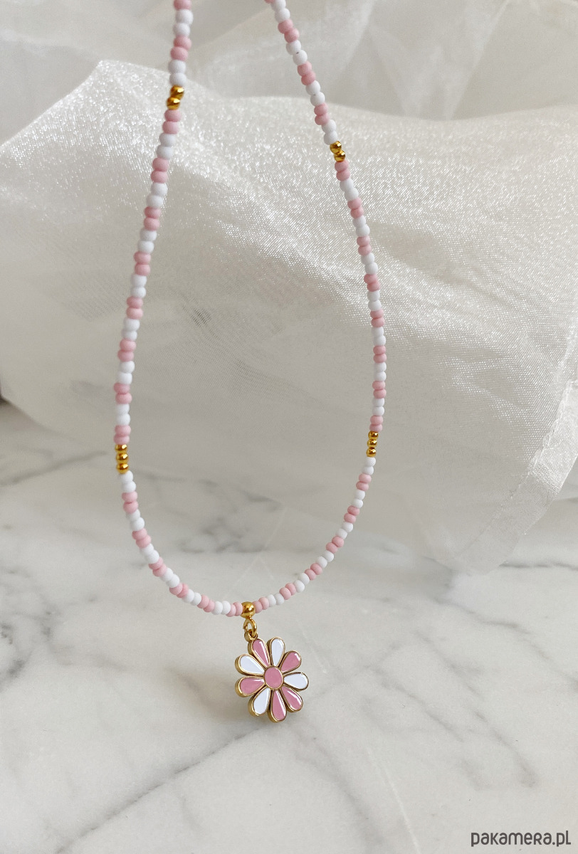 Naszyjnik wykonany z japońskich koralików Toho w pastelowych kolorach. Emaliowany, pastelowy kwiatek realnie uzupełni każdą stylizację.