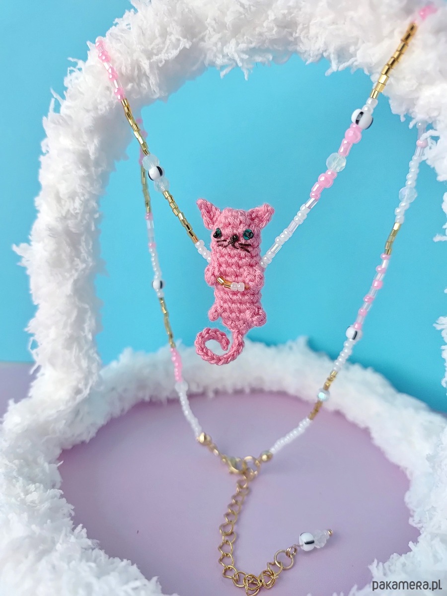 Naszyjnik z koralików z różowym kotkiem robionym na szydełku