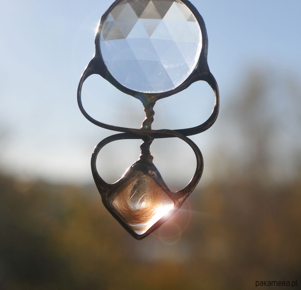 Oryginalny naszyjnik wykonany z fasetowanego szkiełka i małego szklanego rombu, w którym zamknięto dziecięcy loczek.