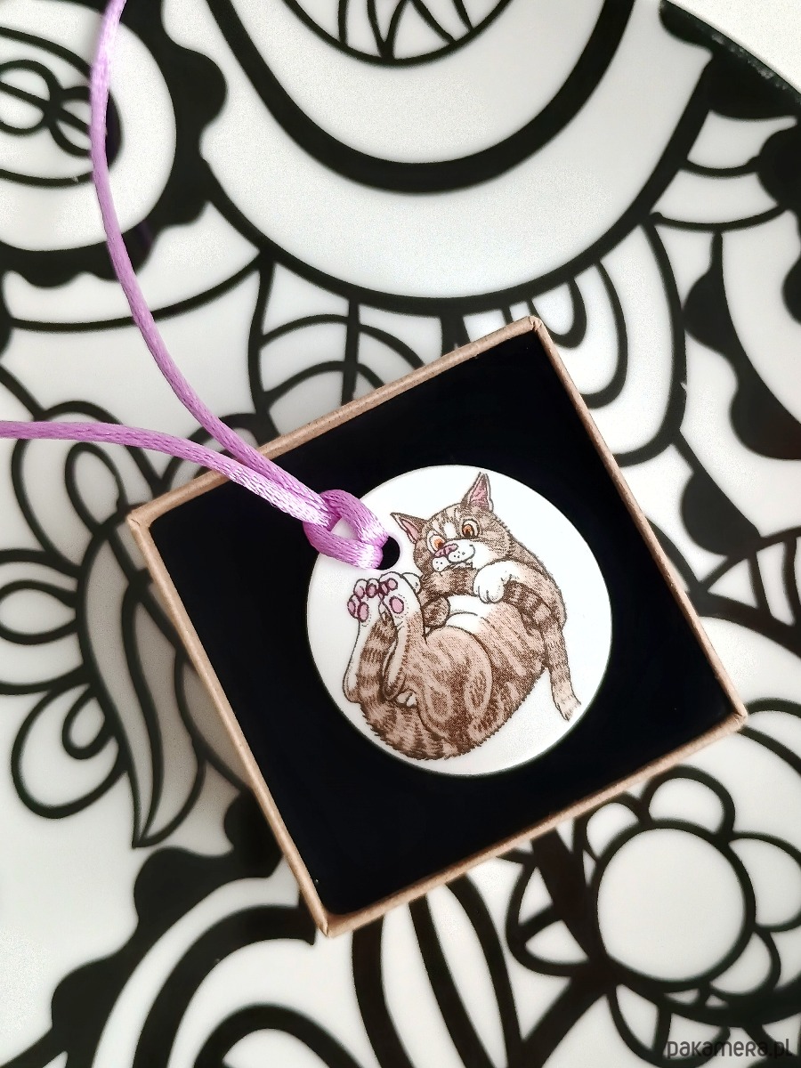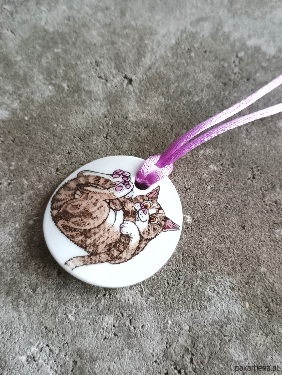 Oto naszyjnik, który wykonałam z fragmentu stłuczonego kubka w koty. Element ceramiki oszlifowałam w okrągły kształt i wykonałam otwór. Brzegi pokryłam lakierem, co sprawia, że nie brudzą się i nie chłoną wilgoci. Do zawieszki dobrałam satynowy sznureczek w kolorze fioletowym. Średnica elementu ceramicznego: 40 mm. Długość sznureczka w całości: ok. 80 cm (naszyjnik zakłada się przez głowę). Sznurek łatwo skrócić lub dobrać swój ulubiony rzemień lub łańcuszek. Upcykling - nie reprodukuję wykorzystywanych wzorów, niczego nie domalowuję - wykorzystuję wyłącznie oryginalne naczynia i motywy, które się na nich znajdują. Tym samym, stłuczce z odzysku nadaję nowe życie.
