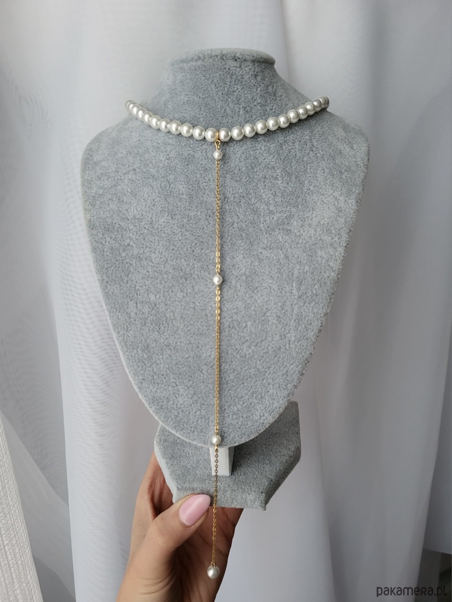 Naszyjnik z pereł z długą krawatką w postaci łańcuszka z małymi perełkami, wykonany z perły muszlowej i stali szlachetnej pozłacanej. Krawatka dopinana jest do naszyjnika za pomocą federinga, dzięki czemu naszyjnik można nosić również w wersji klasycznego naszyjnika bez krawatki. Krawatka zakończona jest perełką. Naszyjnik zapinany jest na karabińczyk, z możliwością regulacji długości, dzięki dodatkowej przedłużce (+5 cm), z logo Afroditte na jej końcu. Naszyjnik prezentuje się bardzo elegancko, klasycznie i luksusowo, a wisząca krawatka dodaje mu zmysłowości.