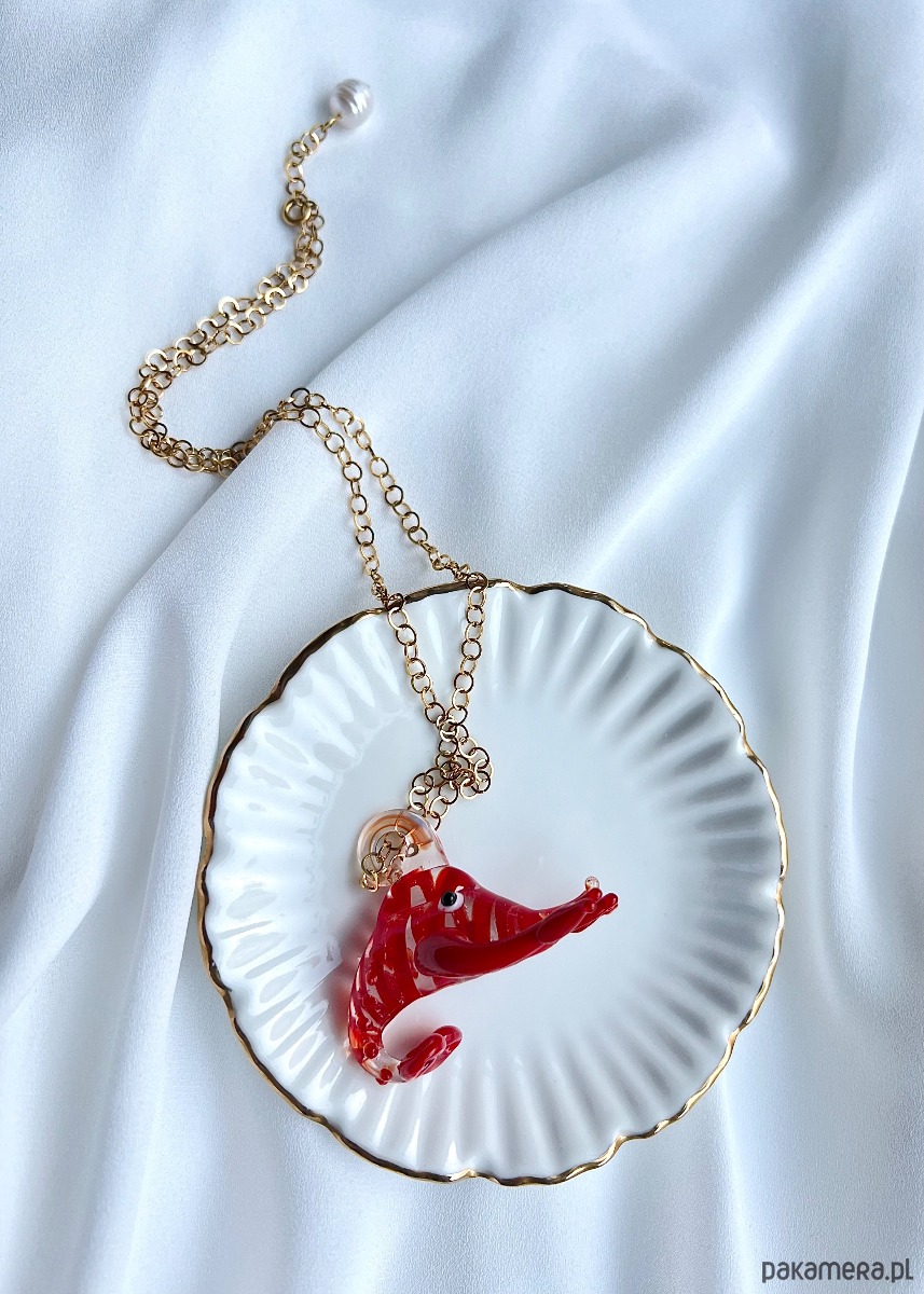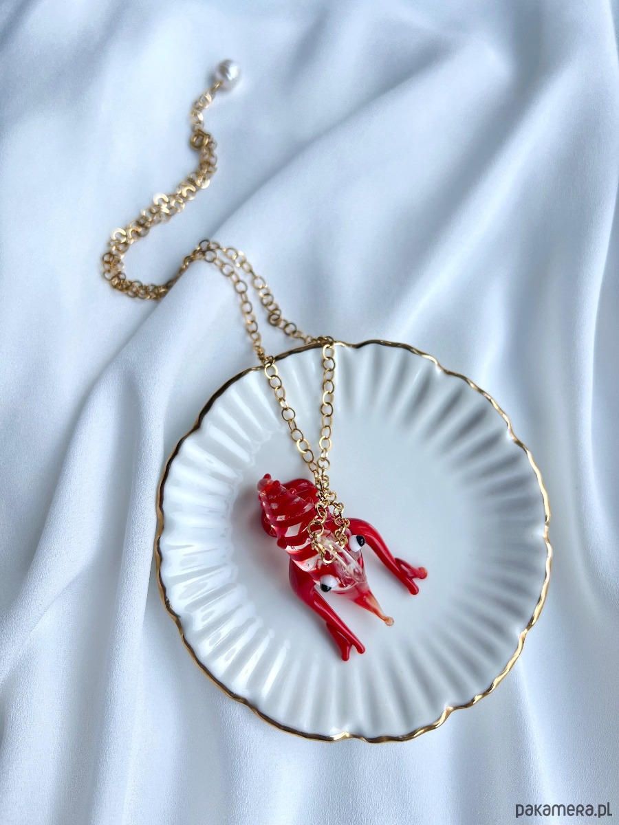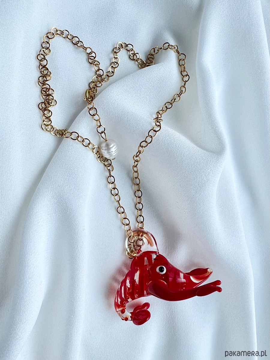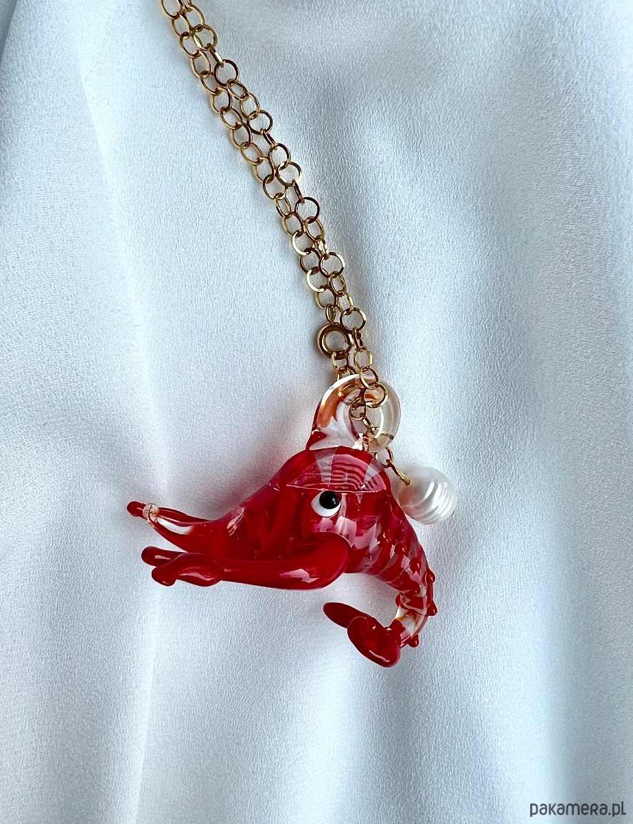 Na łańcuszku o okrągłych oczkach wykonanym ze stali chirurgicznej powieszona jest szklana duża krewetka w kolorze czerwieni. Łańcuszek wykończony jest niewielką perełką, którą możesz nosić z przodu lub z tyłu naszyjnika.