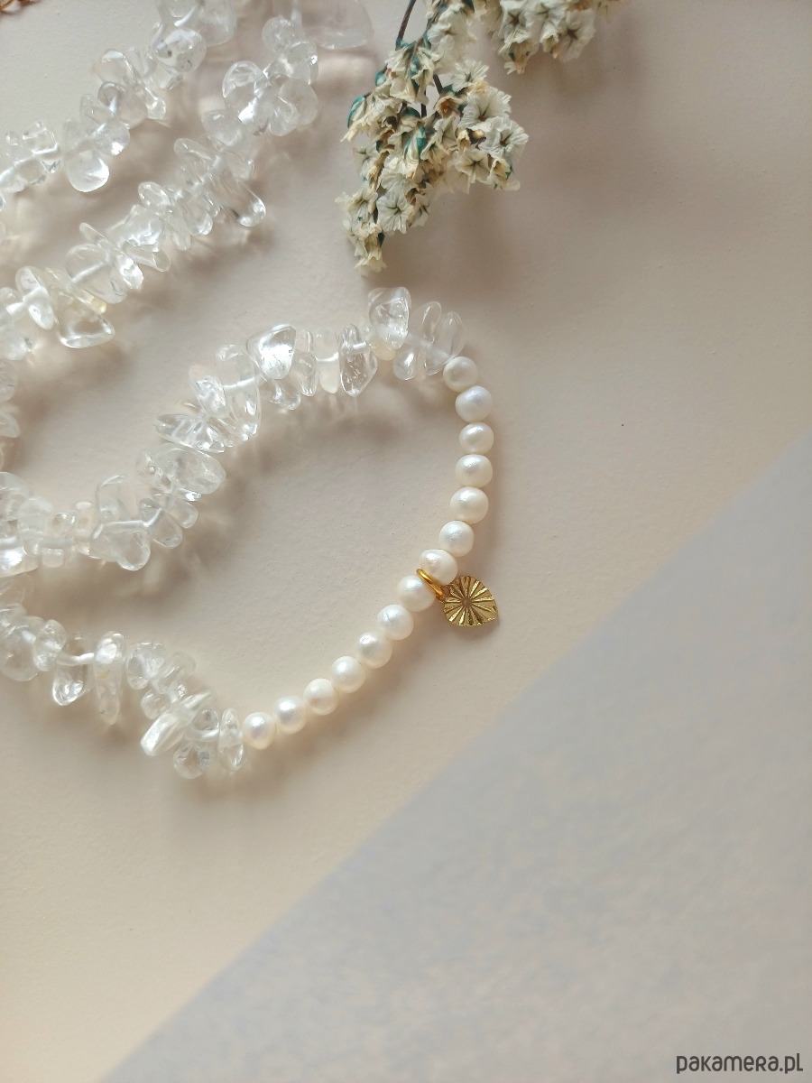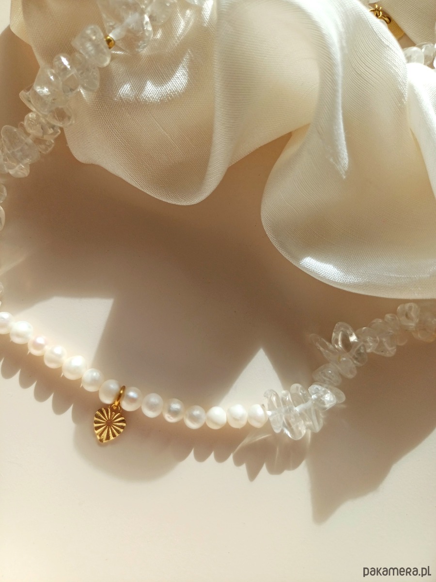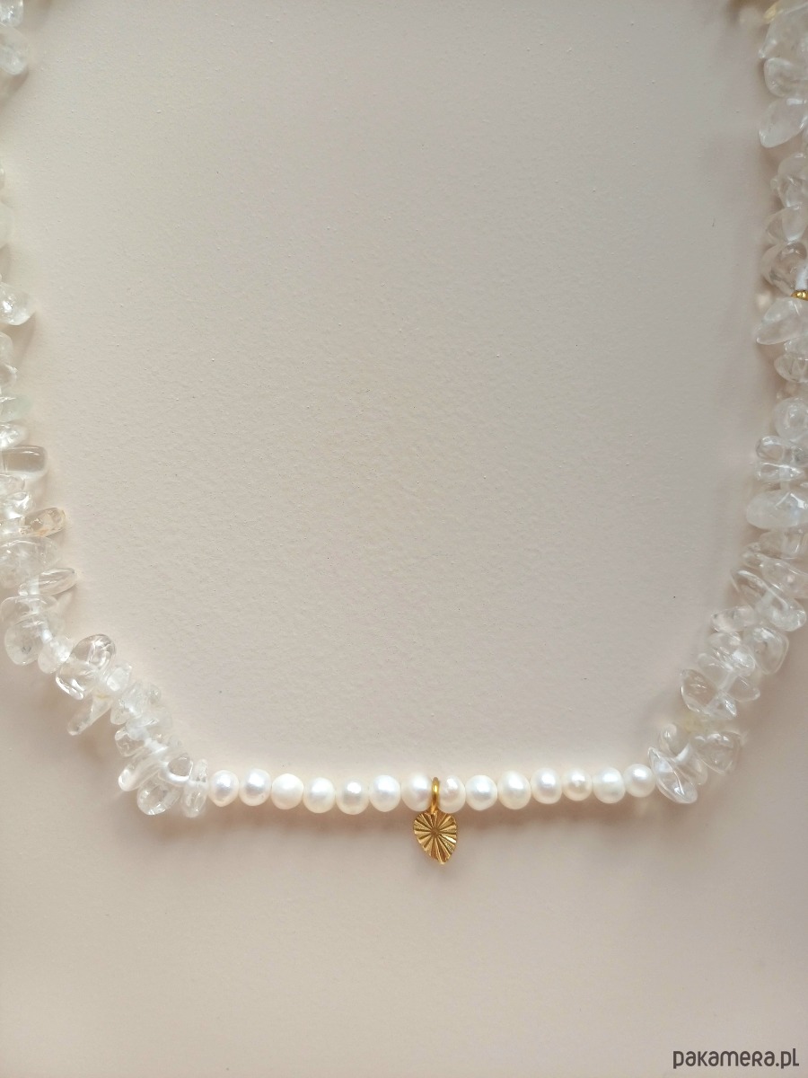 Unikalny design. Bardzo kobiecy, delikatny naszyjnik wykonany z kryształu górskiego i pereł naturalnych słodkowodnych. Elegancja w jednym wydaniu. Motyw serca jako centrum. Idealny dla kobiet ceniących sobie harmonię wokół siebie. Dopasowany na wyjątkowe okazje, do prostych stylizacji.