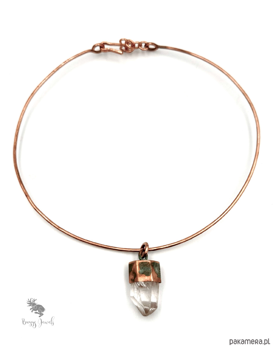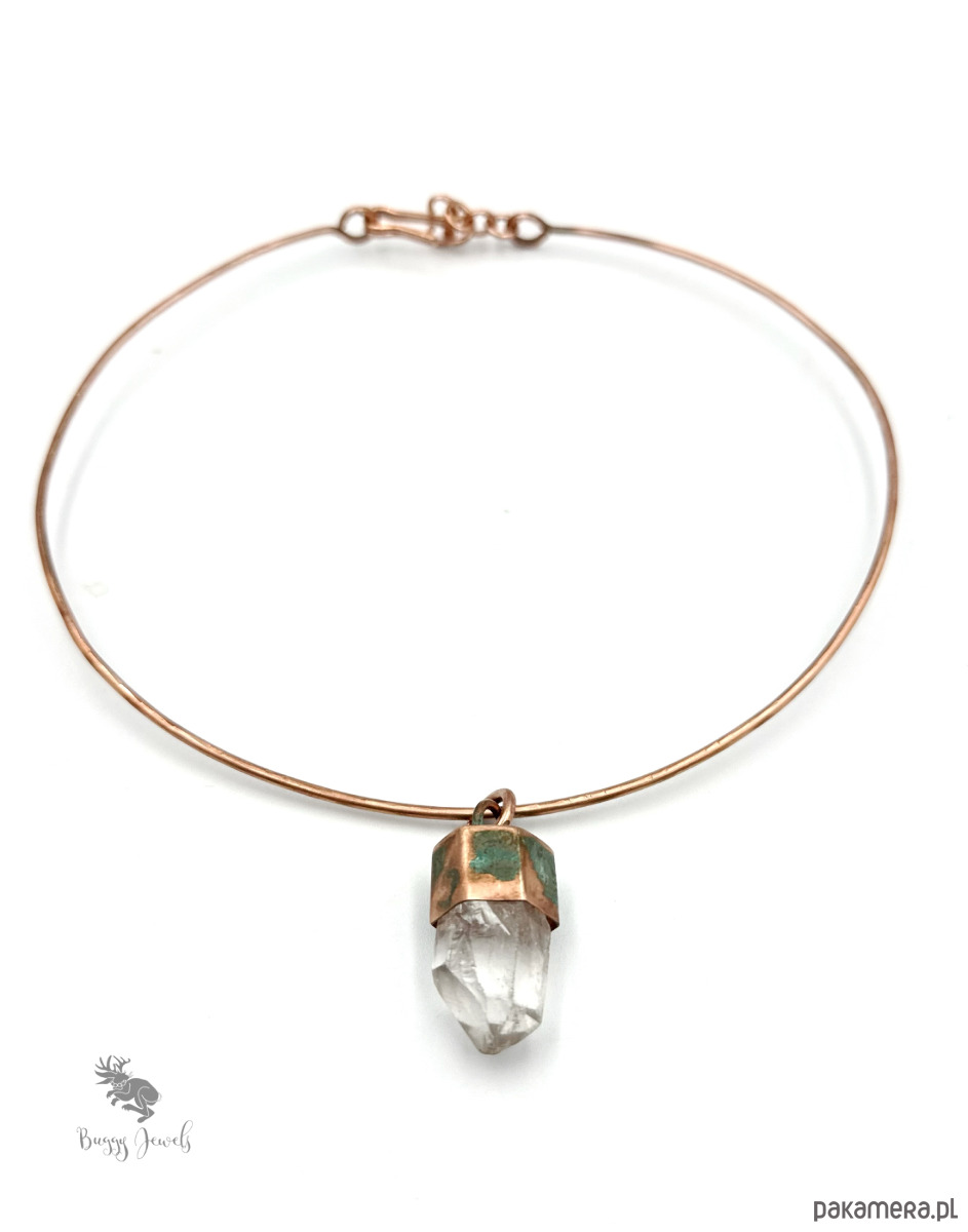 Naszyjnik wykonany z miedzianego drutu oraz bardzo surowego kryształu górskiego.