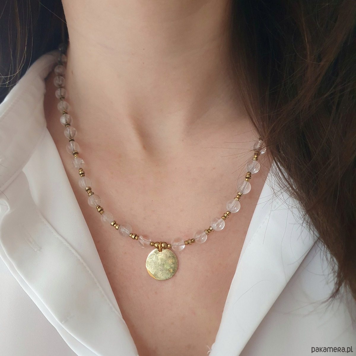 Naszyjnik wykonany z kamieni naturalnych: kryształy górskiego oraz złotego hematytu na wytrzymałej lince jubilerskiej. Wykończony zapięciem z antyalergicznej stali szlachetnej.