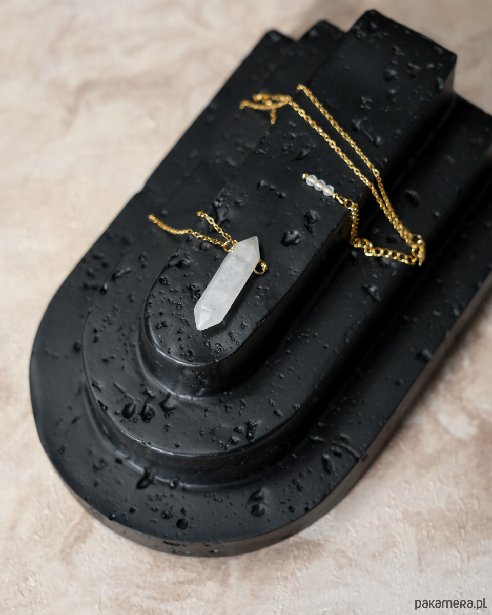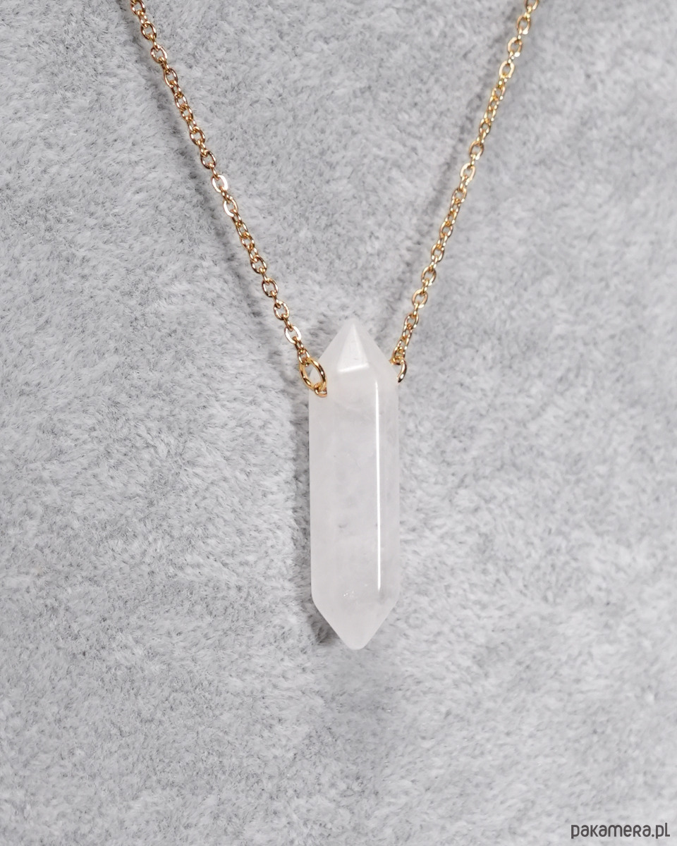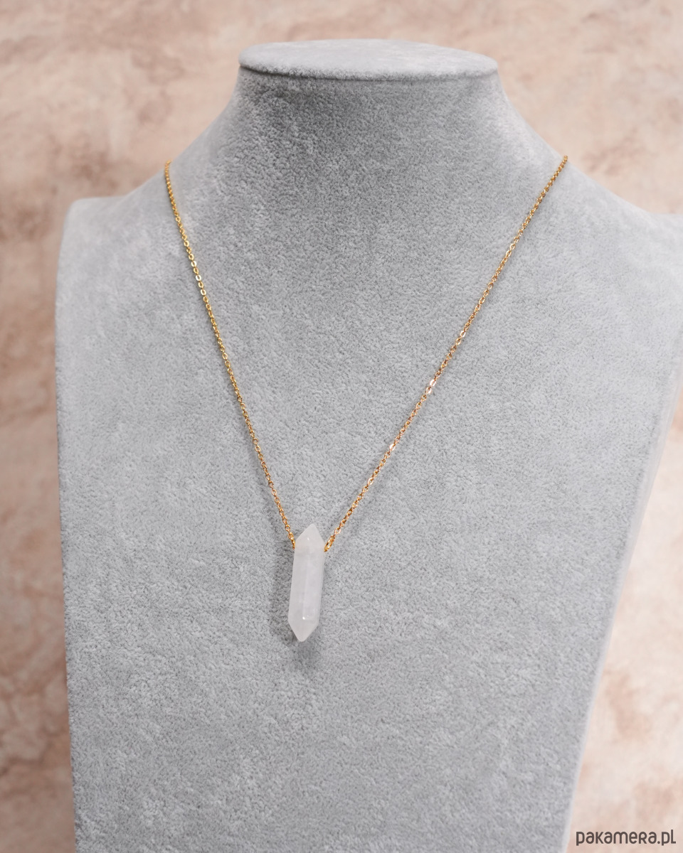 Minimalistyczny naszyjnik z KRYSZTAŁEM GÓRSKIM w kształcie grota, zawieszonym na delikatnym łańcuszku ze STALI SZLACHETNEJ. Będzie się pięknie prezentował solo, jak i w połączeniu z innymi naszyjnikami i łańcuszkami ułożonymi kaskadowo.