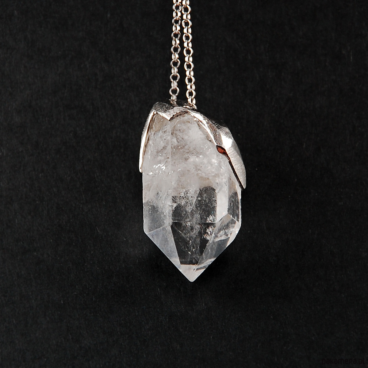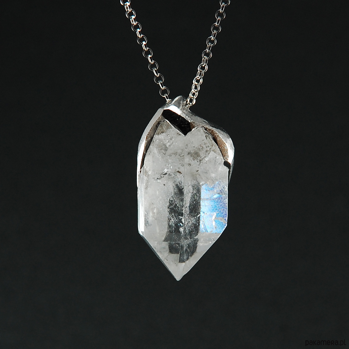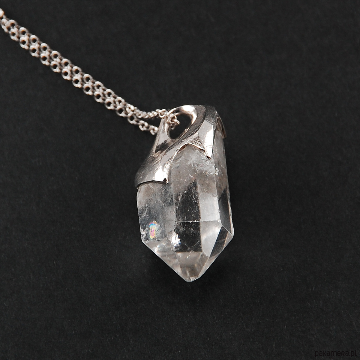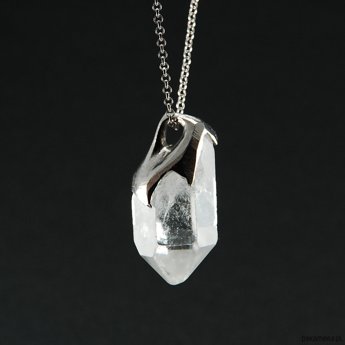 Naszyjnik wykonany z unikatowej bryłki kryształu górskiego oprawionego w srebro.