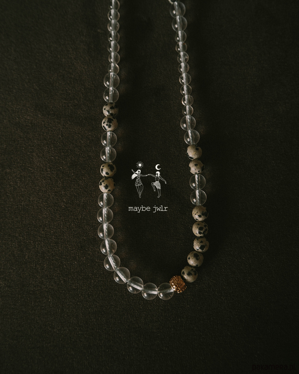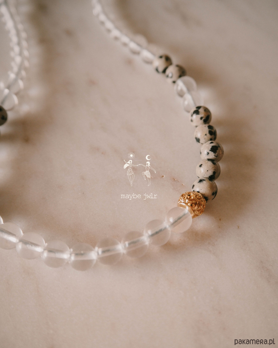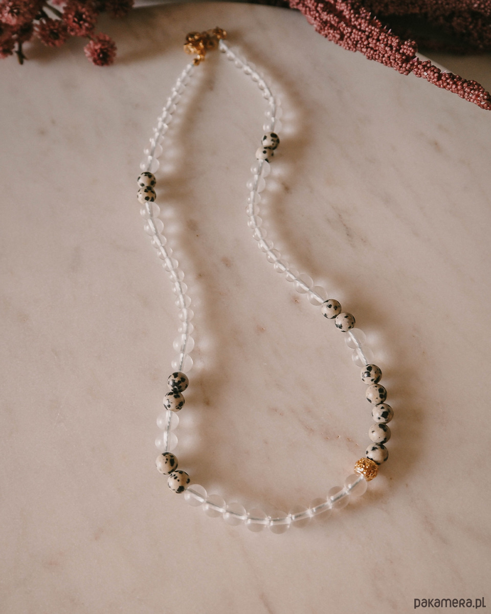 Ten naszyjnik to połączenie przejrzystości i struktury, światła i ziemi. Z jednej strony kryształ górski – znany jako „król kryształów”, symbol klarowności, świeżej energii i wewnętrznego balansu. Z drugiej jaspis dalmatyński – kamień, który dodaje lekkości, odwagi i dobrego nastroju. Razem tworzą duet, który wygląda subtelnie, a jednocześnie ma w sobie moc.